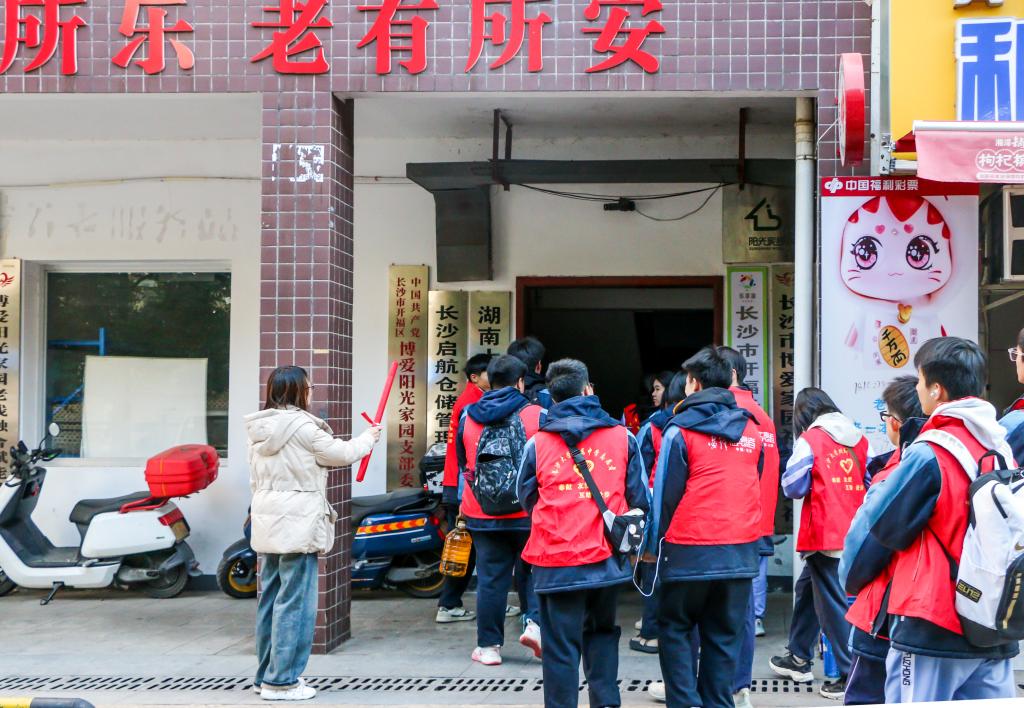 下午,阳光灿烂,志愿者们穿着红马甲,举着旗帜出发了。一路上大家沿着福元路,穿过洪山大桥,来到四方坪滨江社区博爱阳光家园。