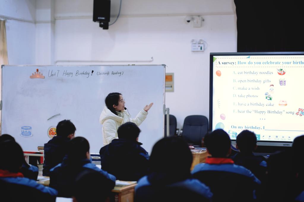 长沙市卓越教师、长沙县优秀教研工作者,曾获得第五届“黑布林”英语阅读优课大赛全国特等奖的银洁老师以其成熟精湛的教学技艺呈现了七年级下册Unit7Happy Birthday!的生动课例。展示课以情境教学为主线,创设真实的生日派对情境,将AI运用于整堂课的教学,从导入环节的AI卡通形象“Cakebaby”唱生日歌,到提问环节的AI豆包解答释义,让大家感受到了智慧课堂带来的“科技感”“智能化”。银洁老师巧妙地借助精美的生日派对图片和生动的动画视频,增强同学们的学习兴趣与参与度,让他们更高效地掌握重点词汇、句型和语法知识。在小组讨论环节,她还精心设计了“最佳生日企划”投票评选,C2401班的同学们热情高涨,纷纷主动上台展示自己的创意成果,努力争取大家的选票,在轻松愉快的课堂氛围中,同学们学习了英语知识,提高了英语技能,还感受到英语文化的独特魅力。