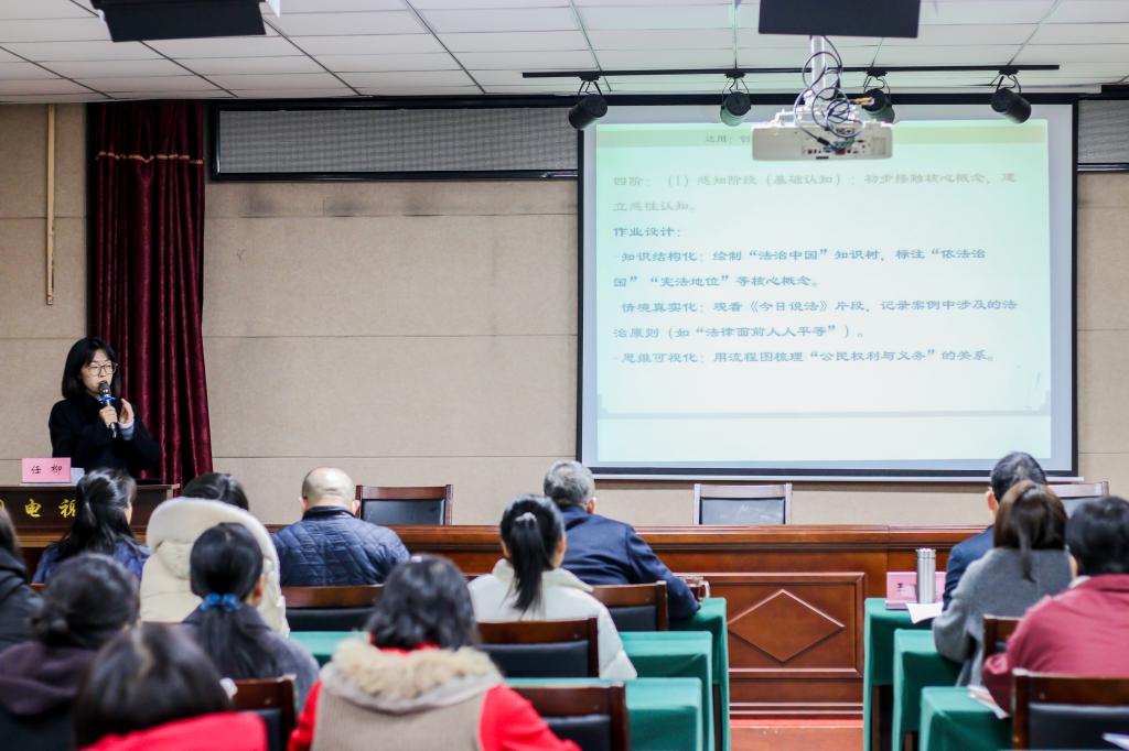 任柳老师展示了她的课题——“大单元教学视角下中学思政课作业设计与学生思维品质提升策略研究”。该课题以学生发展核心素养为导向,通过对思政课作业内容、形式、评价等多个维度的创新设计,分阶段引导学生从单一结构思维逐步向关联结构思维迈进,打破了传统教学的碎片化局限。