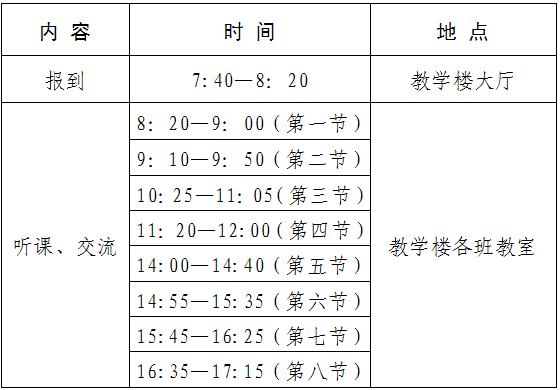 全校所有课堂全部开放。采用重点推荐和全面开放相结合的方式,每门学科安排推荐课,同时,学校所有教师的课都对外校教师开放。