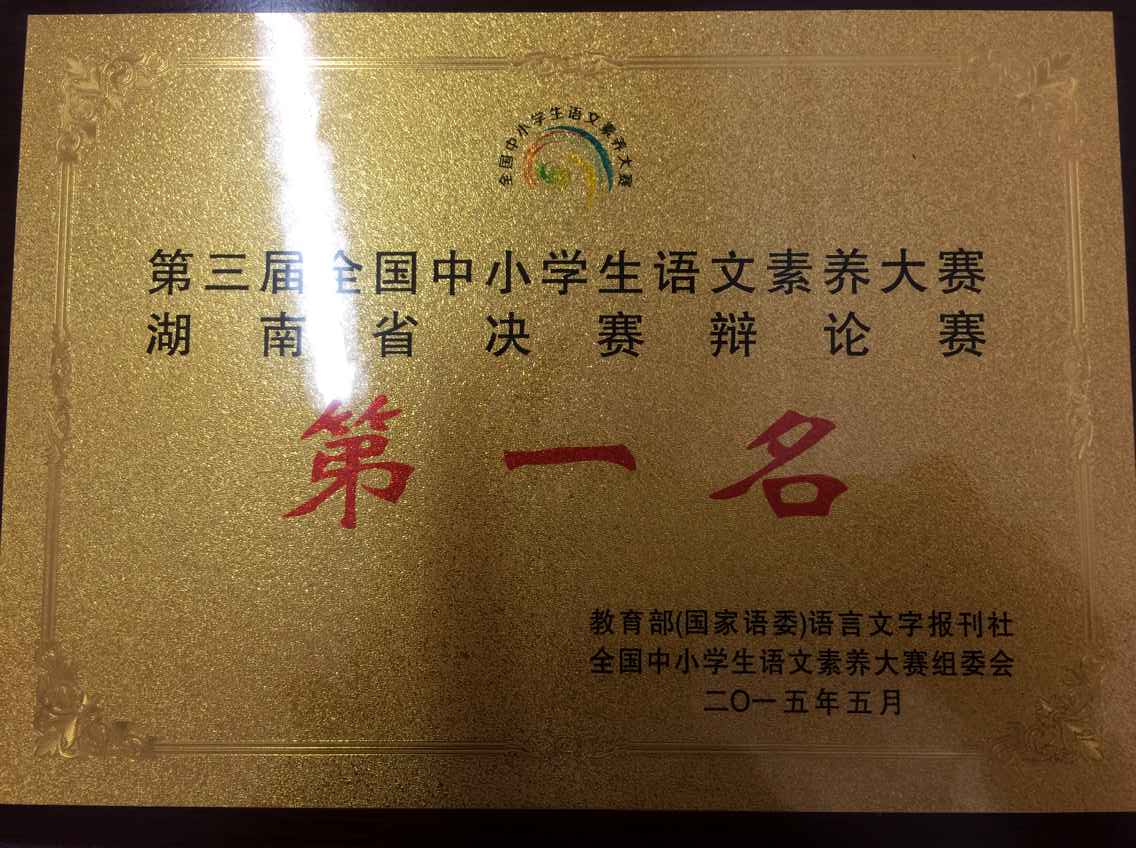第三届全国中小学生语文素养大赛湖南省复赛于2015年5月8日至10日在长沙市芙蓉区国防教育训练基地拉开帷幕。参加此次比赛的有来自长沙城区共20所学校。在所有参赛队伍中,不乏省级示范性学校的优秀选手,也有不少才艺突出的兄弟学校代表。附中由初一初二年级14名参赛学子组成的参赛团队,在校初中语文组和体艺组组成的指导教师团队精心指导下一路过关斩将,展现了强大的实力,几乎所有语言类项目都有斩获,其中团队展示节目一等奖、初中组辩论赛第一名奖牌均为附中学生摘得,并以14人参赛,获奖69人次载誉而归。附中也在此次大赛中荣获优秀组织奖。
