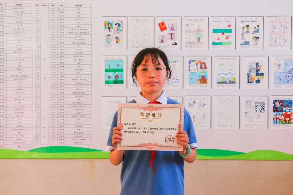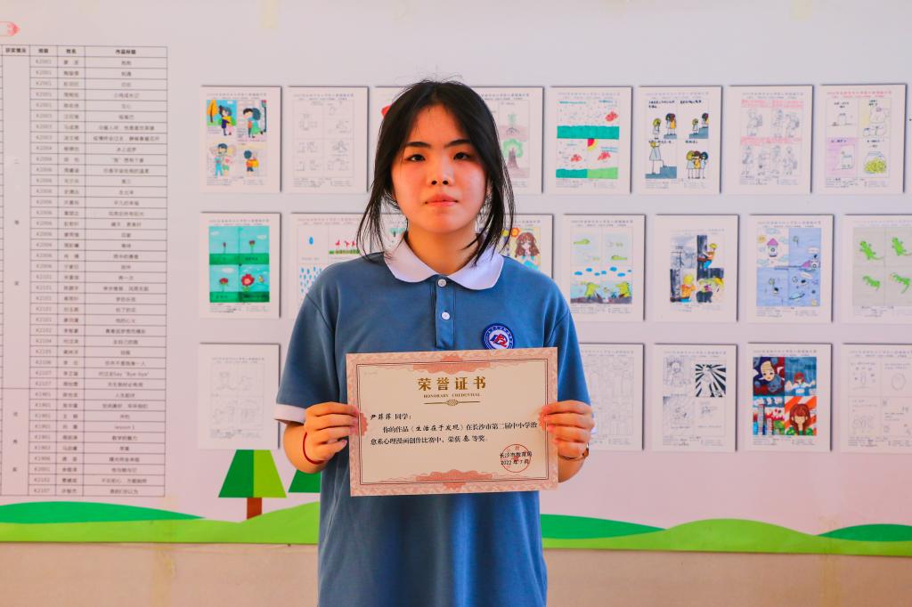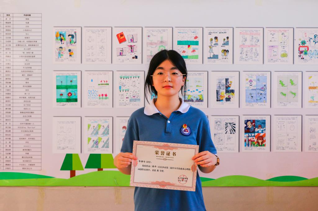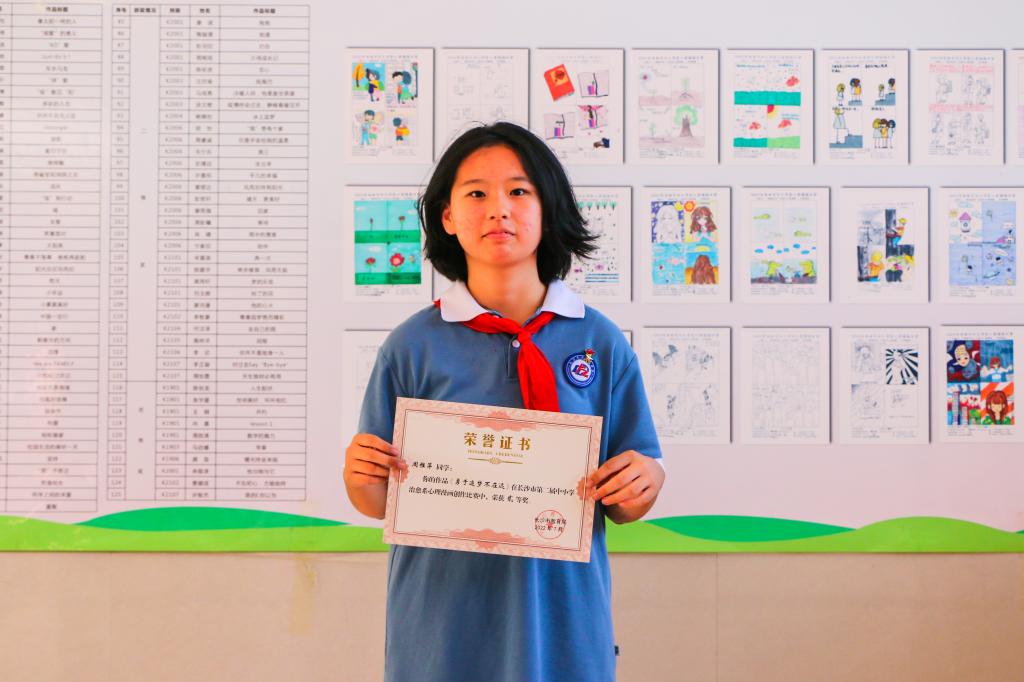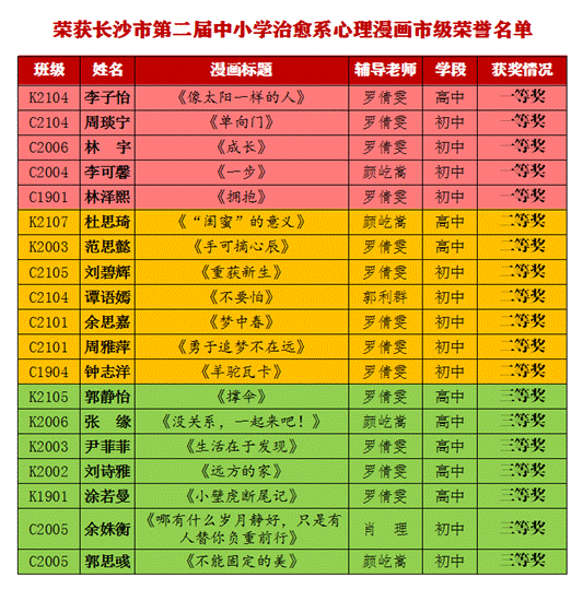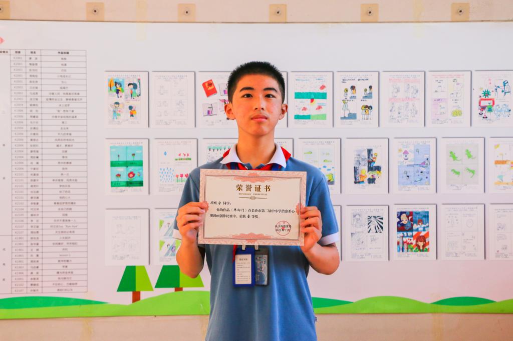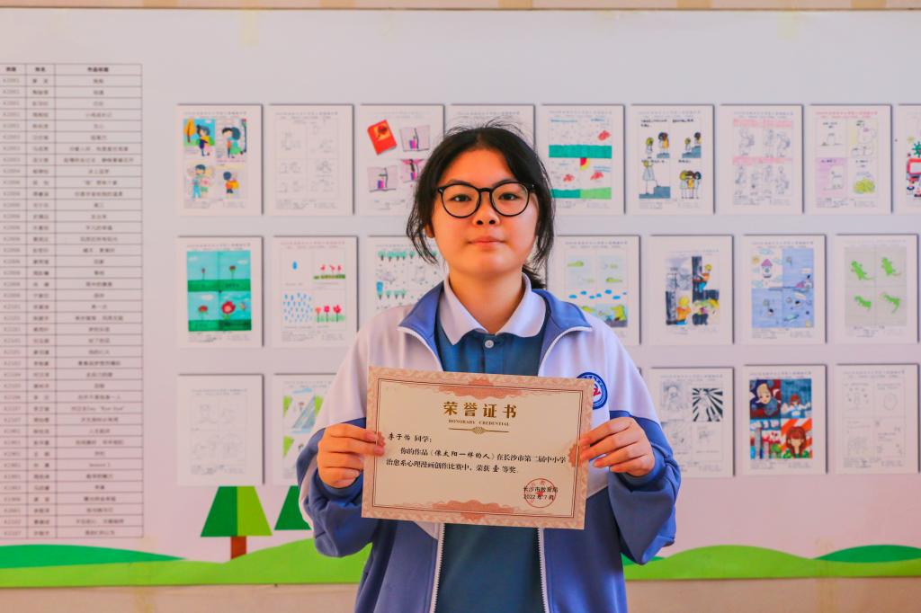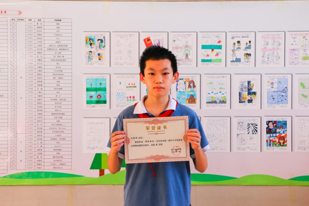 在长沙市第二届中小学治愈系心理漫画大赛中,我校共有19位学生作品从众多作品中脱颖而出,荣获佳绩。其中李子怡等5人荣获市级一等奖,杜思琦等7人荣获市级二等奖,郭静怡等7人荣获市级三等奖,颜屹嵩老师、罗倩雯老师荣获“优秀指导教师奖”。