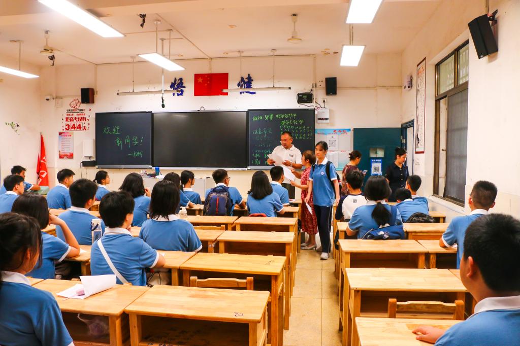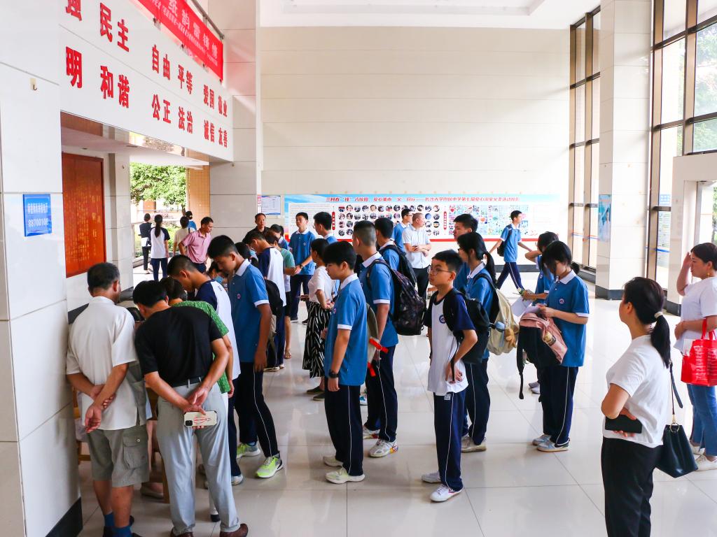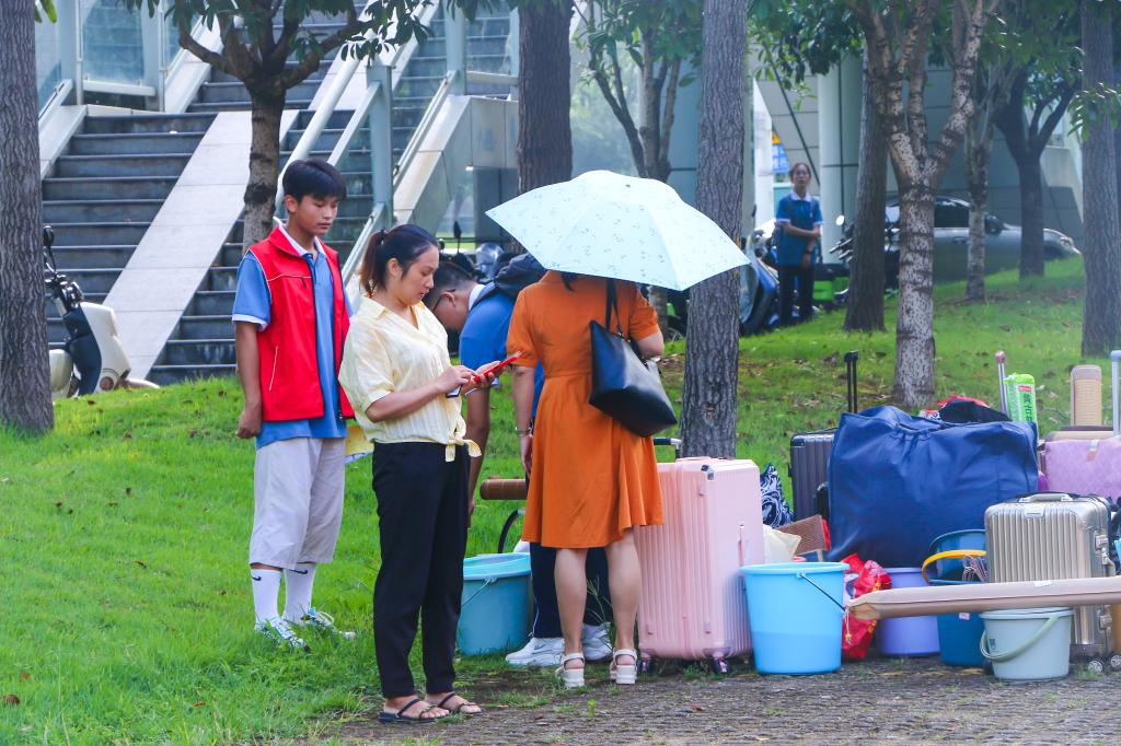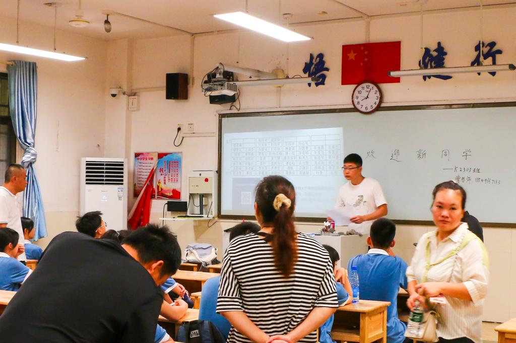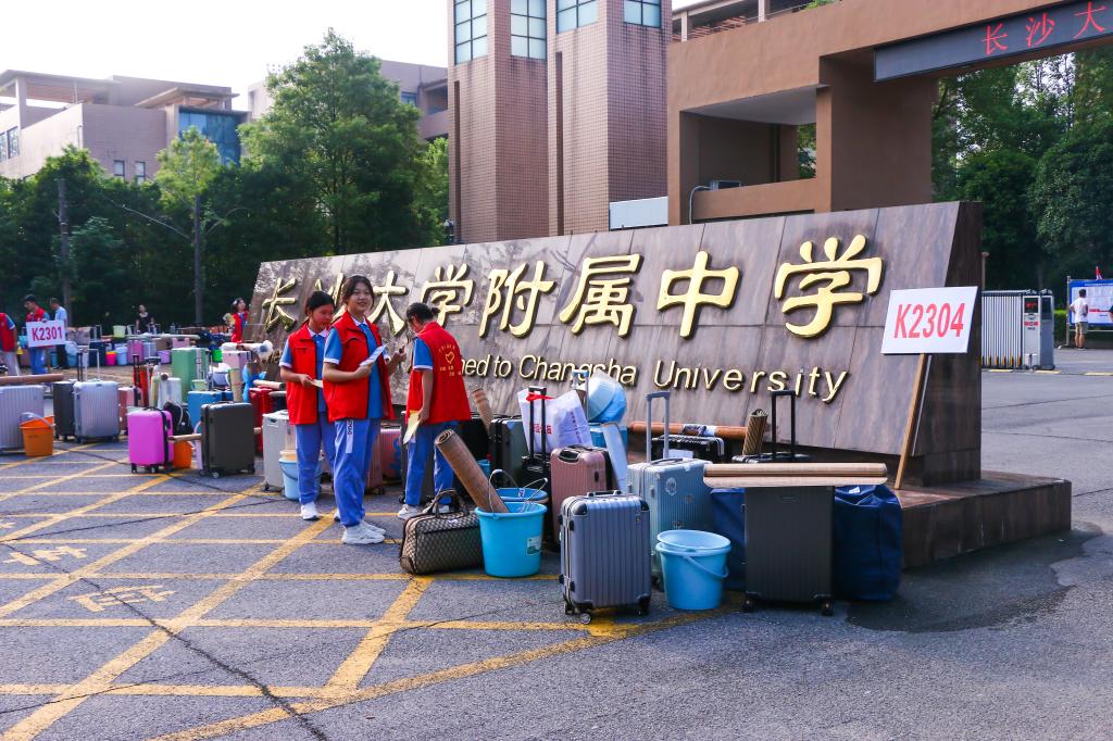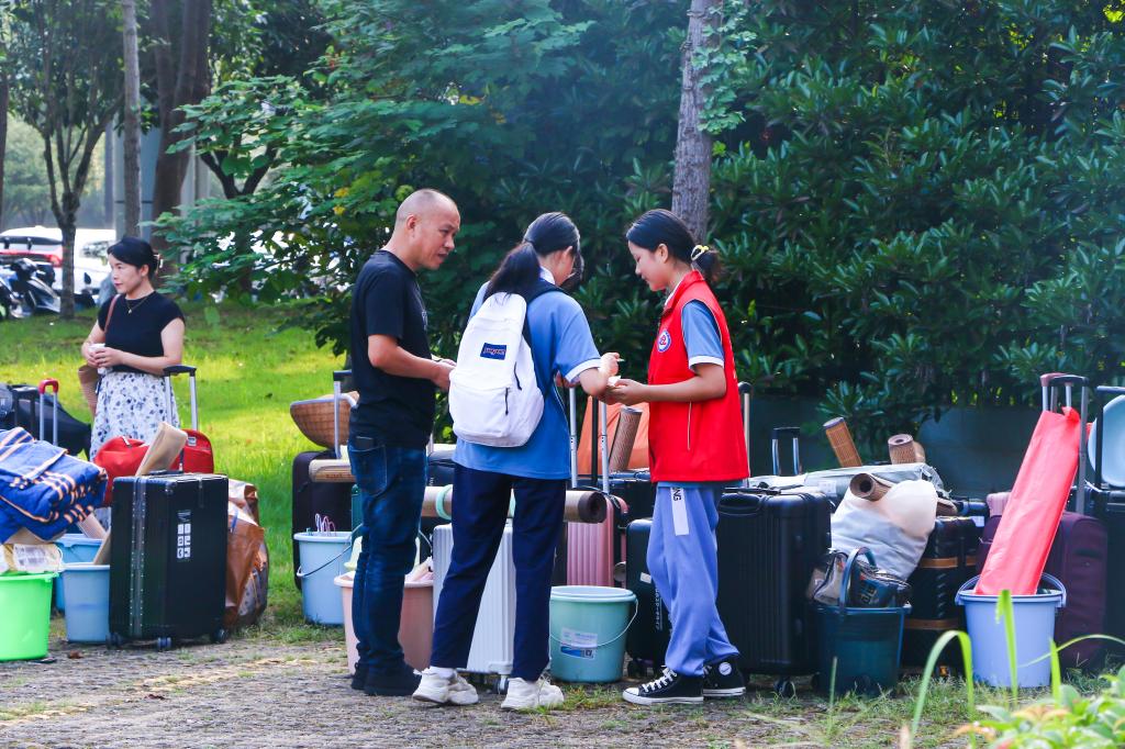高一新生在家长的陪同下,带着行李,来到学校报到。