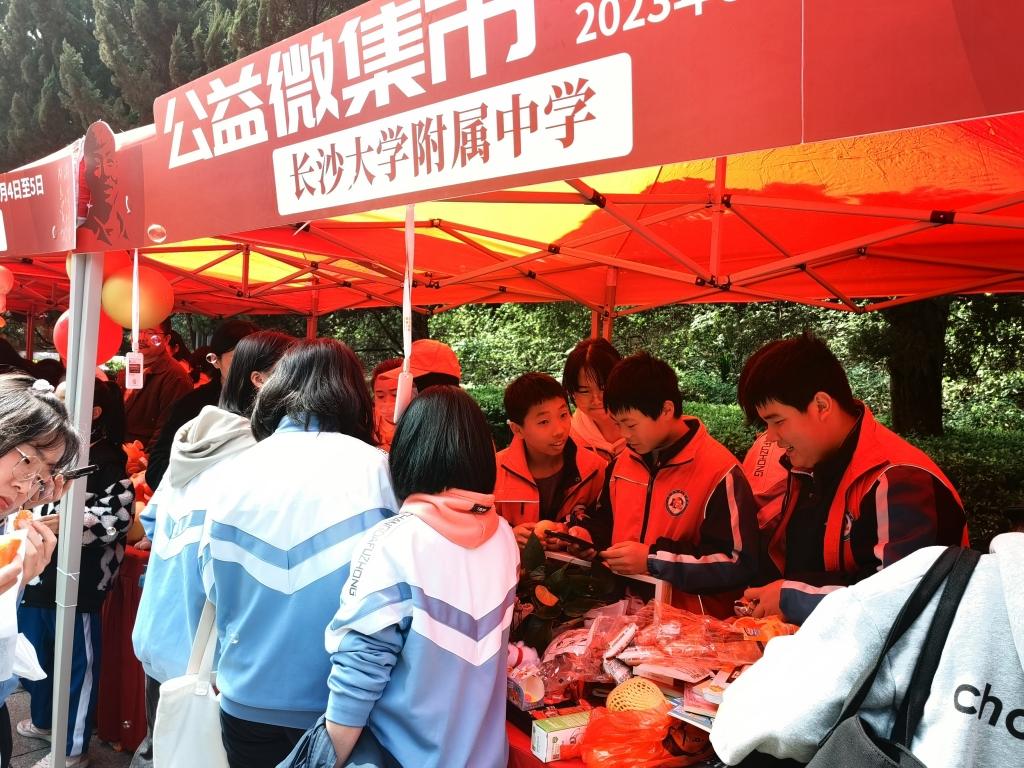 从公园南大门到一级广场,沿途靠左布满了橙色的义卖帐篷,有二十多所学校在这里认领了“公益微集市”义卖摊位,“雷锋少年”们通过义卖的形式为长沙市慈善总会公益项目募集善款。