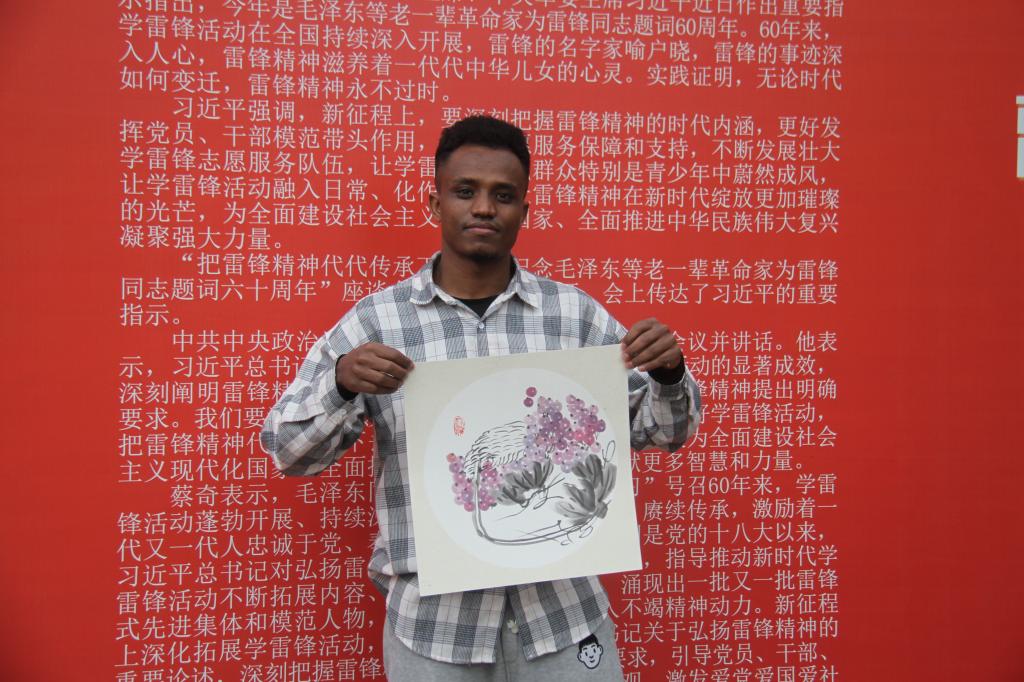 美术覃美云老师画了五幅国画,一位外国友人很喜欢,想购买其中的一幅。义卖员开价15元,没想到外国友人竟然也懂得讨价还价,最终以十元成交,他面带微笑和国画合影留念。