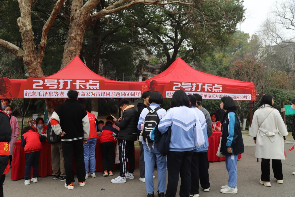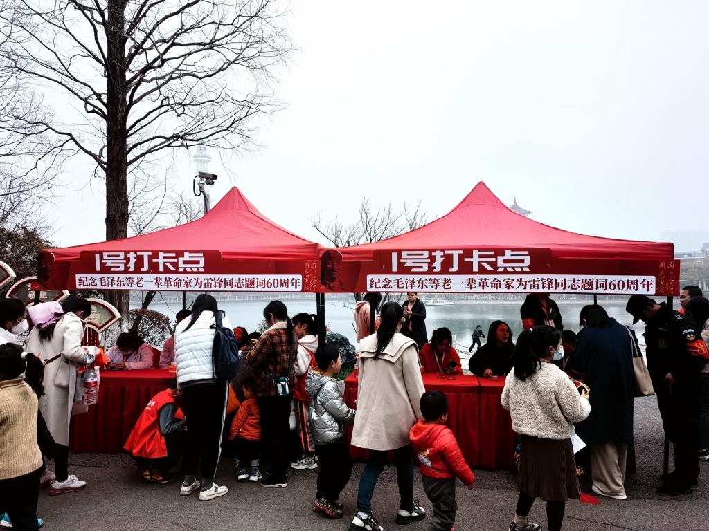 雷锋少年们在南门签到处签到,领取号码牌和活动手册,按照手册上的提示,自主会场出发,经游乐场、游船码头到达打卡点一。在这里拍摄本人参与活动的照片配上学习雷锋的内容与感想发布在社交平台上,即可盖章通关。沿年嘉湖到达红军渡广场打卡点二,通过现场的“雷锋生平”展示和介绍,参与雷锋知识答题,才能通过第二关。再沿着年嘉湖到达三湘四水广场打卡点三,在这里完成“续写雷锋日记”的任务,就可以通过第三关。