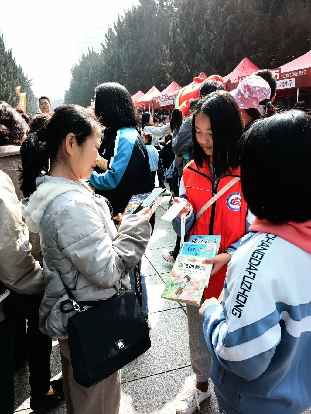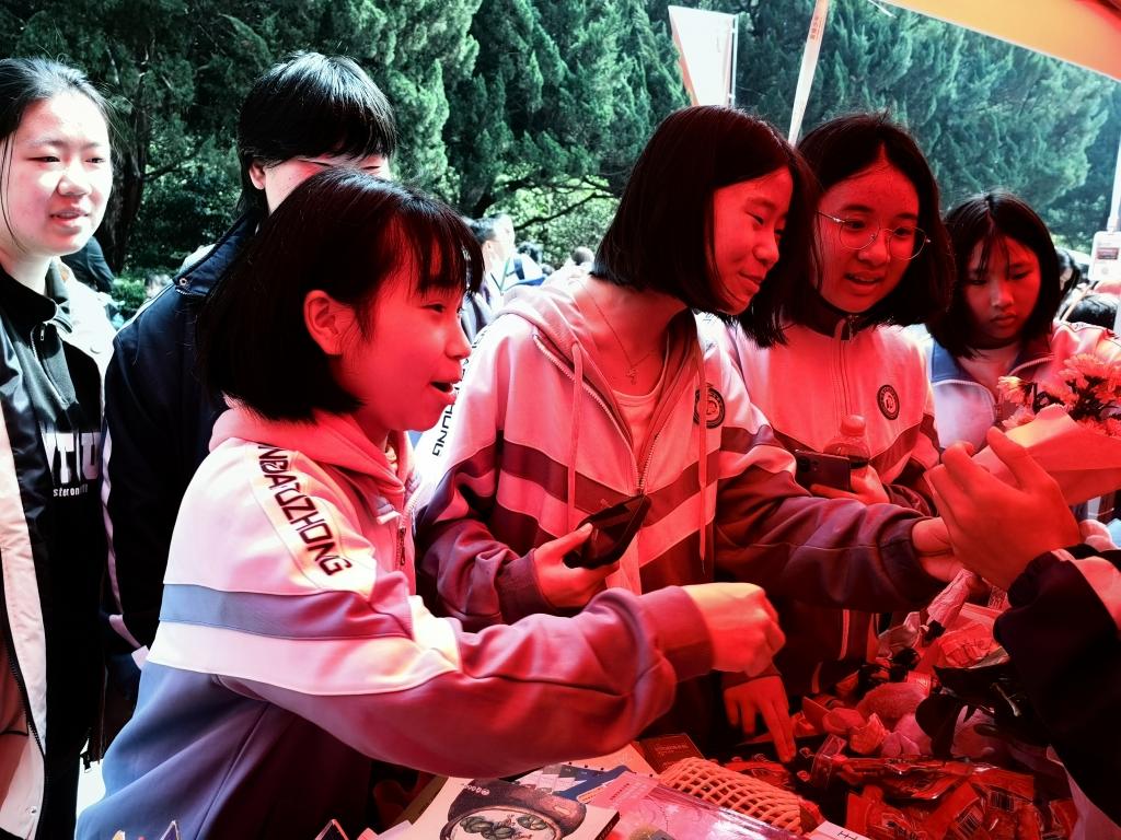 12点多,初二的义卖员们带着货品来交接班。到底是哥哥姐姐,他们一点也不怯场,更不需要家长帮忙,自卖自夸非常在行。除了卖力吆喝以外,更有各种花式夸奖,在他们糖衣炮弹的攻势下,很多顾客乐呵呵地扫码买下了物品。一位小学生来买学习资料,义卖员还向他推销午睡枕头和三层饭盒,一边360度全方位展示,一边眉飞色舞:“你看你学习好,睡得好,吃得好,将来上清华的就是你了!”小学生都懵了,不知自己买一本学习资料怎么就和枕头、饭盒扯上了关系。卖着卖着,越来越多的同学加入了义卖大军,也有不少本校同学来支持自家的产业。