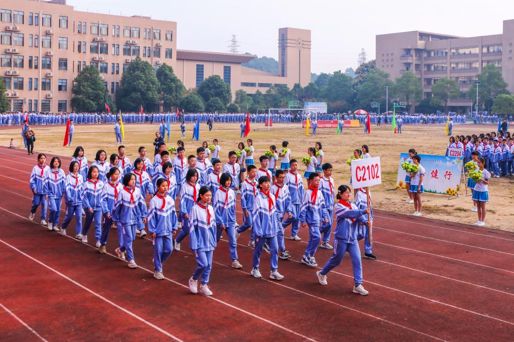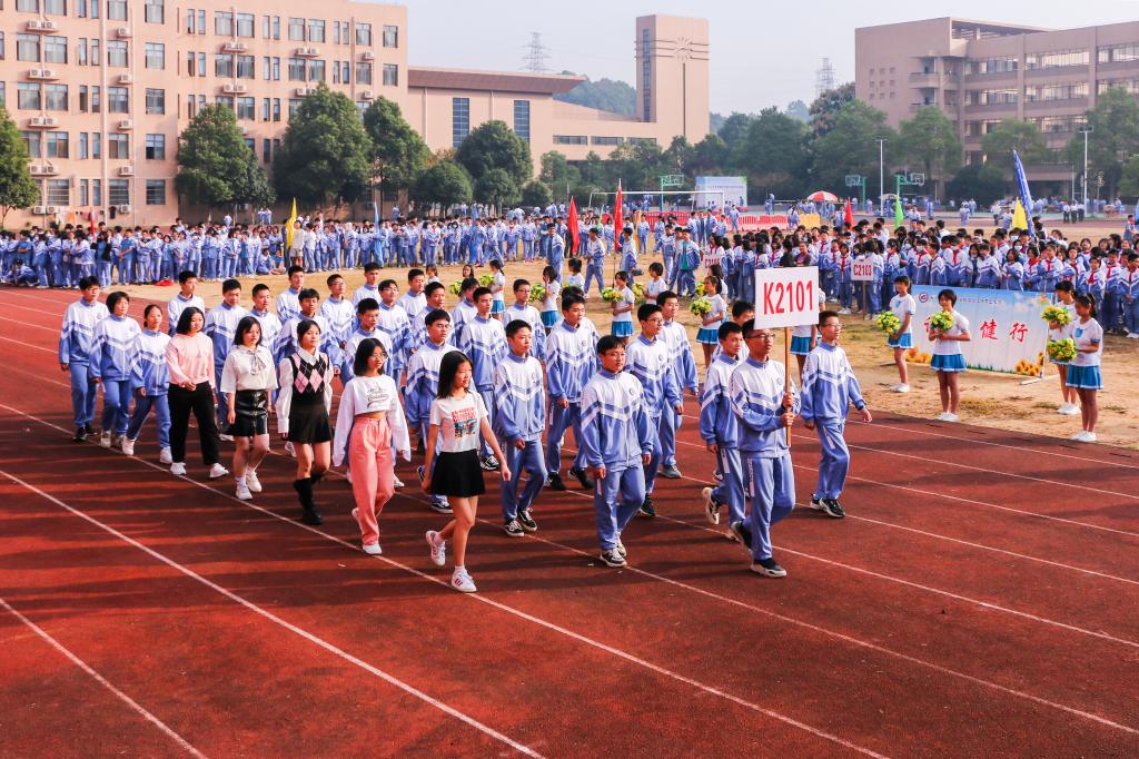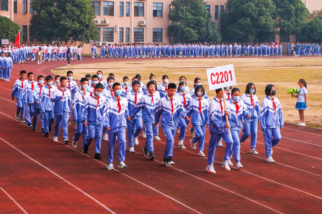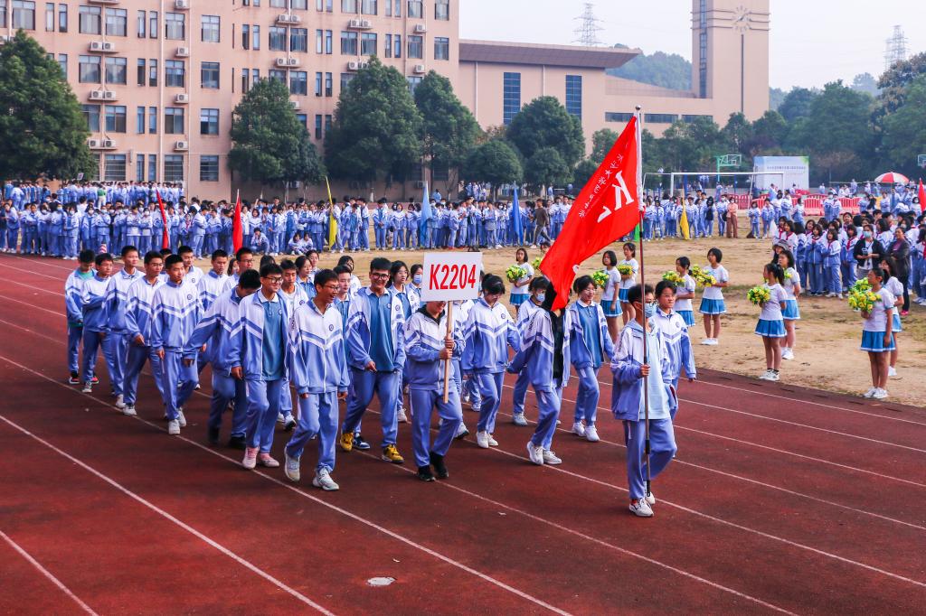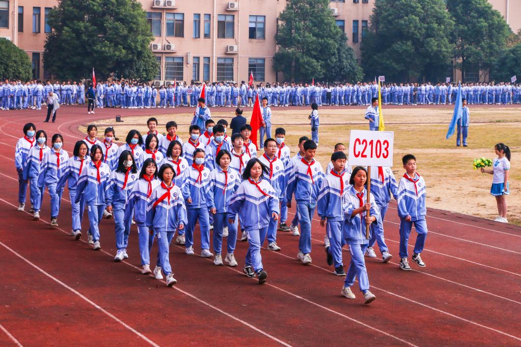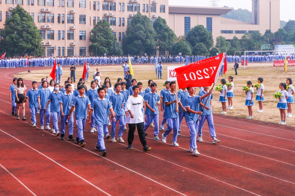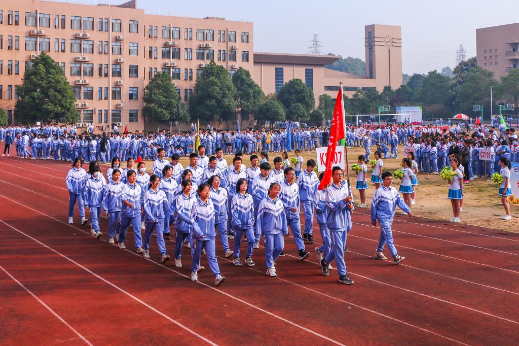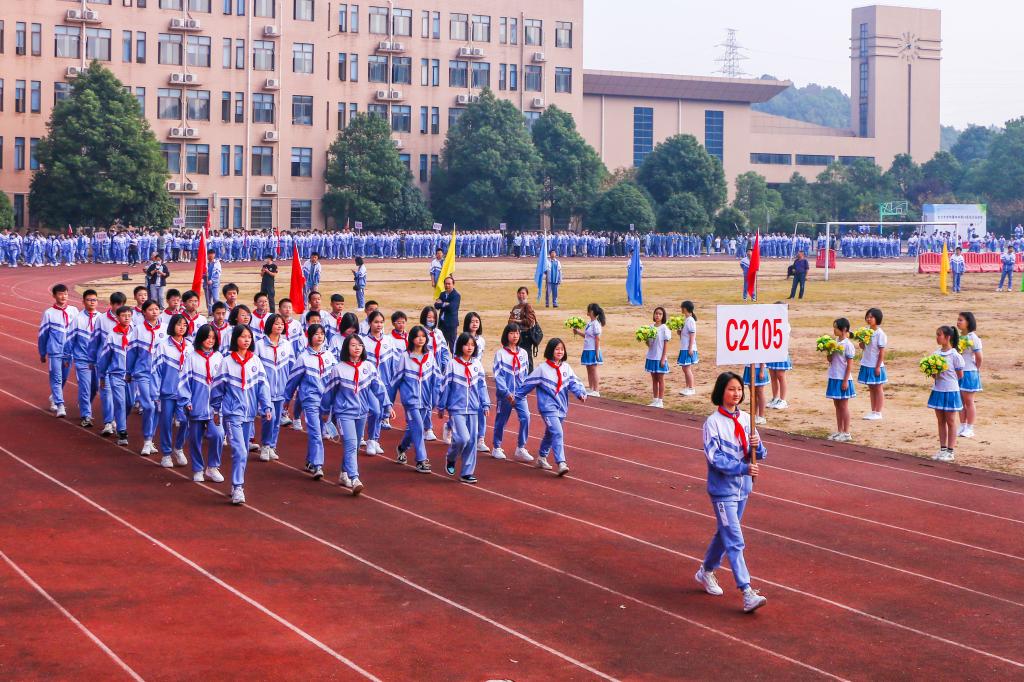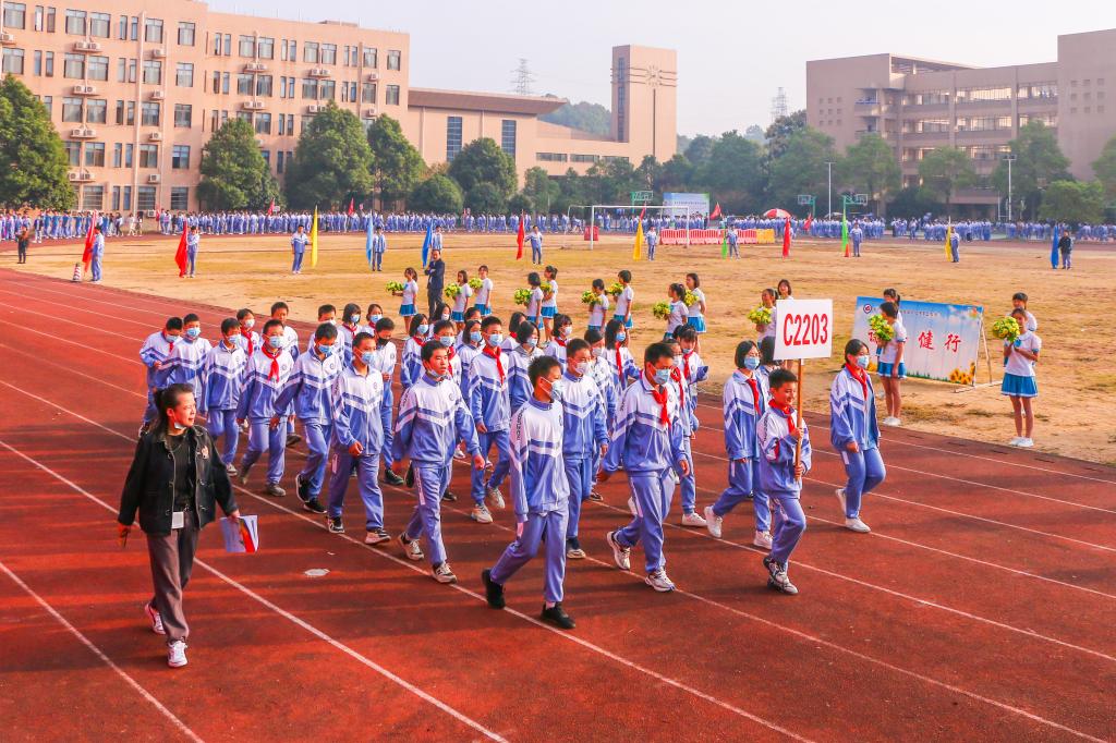 伴随着雄壮的进行曲,国旗方队、鲜花方队、彩旗方队及所有参赛班级方队依次走过主席台,进入指定位置。