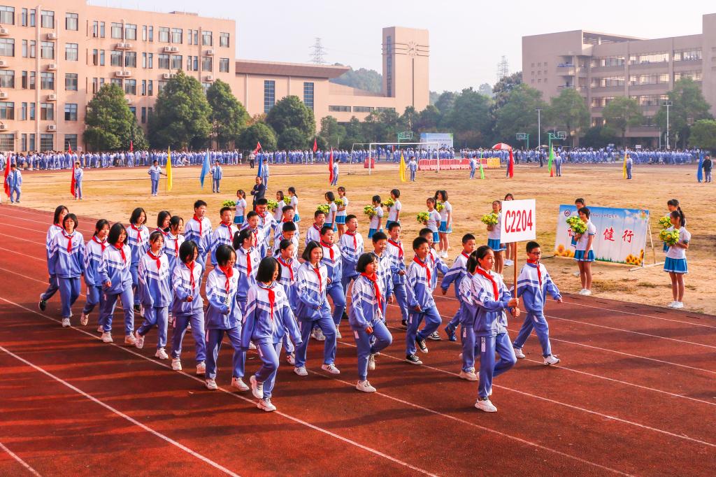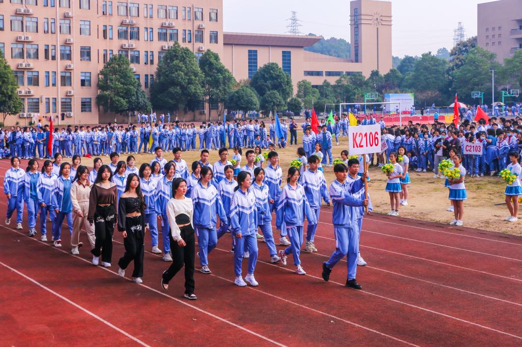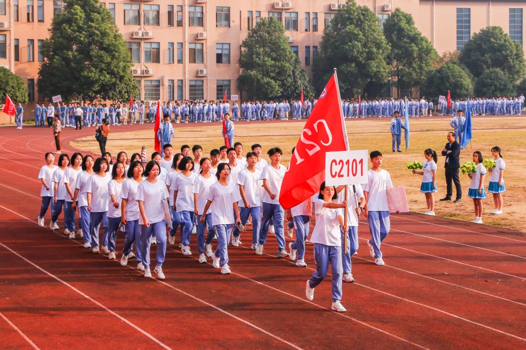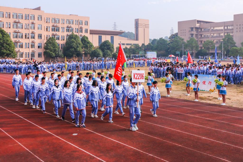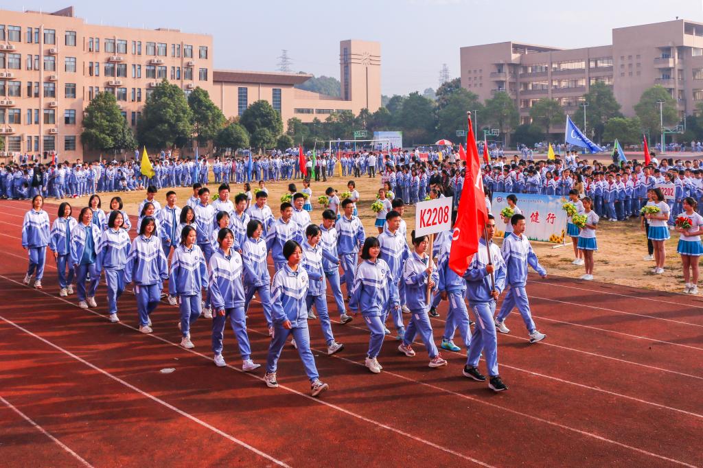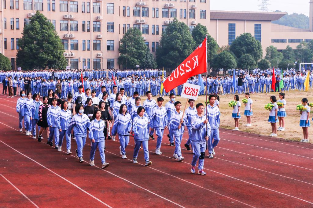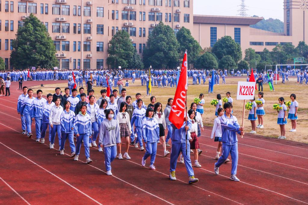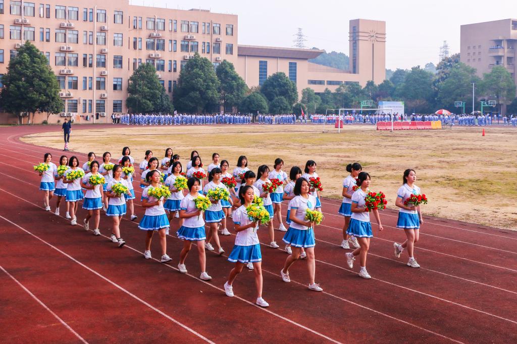 伴随着雄壮的进行曲,国旗方队、鲜花方队、彩旗方队及所有参赛班级方队依次走过主席台,进入指定位置。