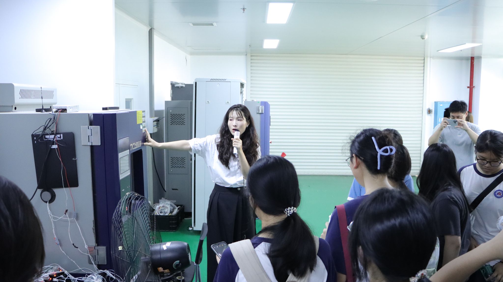 走进硕博电子,同学们立即被专业的科技氛围所感染。在专业讲解员的带领下,大家首先参观了设备先进的实验室。展现在眼前有:恒温恒湿测试系统、静电放电测试仪、车载电子抗扰度检测装置等,讲解员深入浅出地讲解了每台设备的功能。通过了解一项项严谨的测试流程,同学们直观地感受到了企业对产品品质的严苛把控。这种严谨求实的科研态度,在少年们心中种下了崇尚科学的种子。