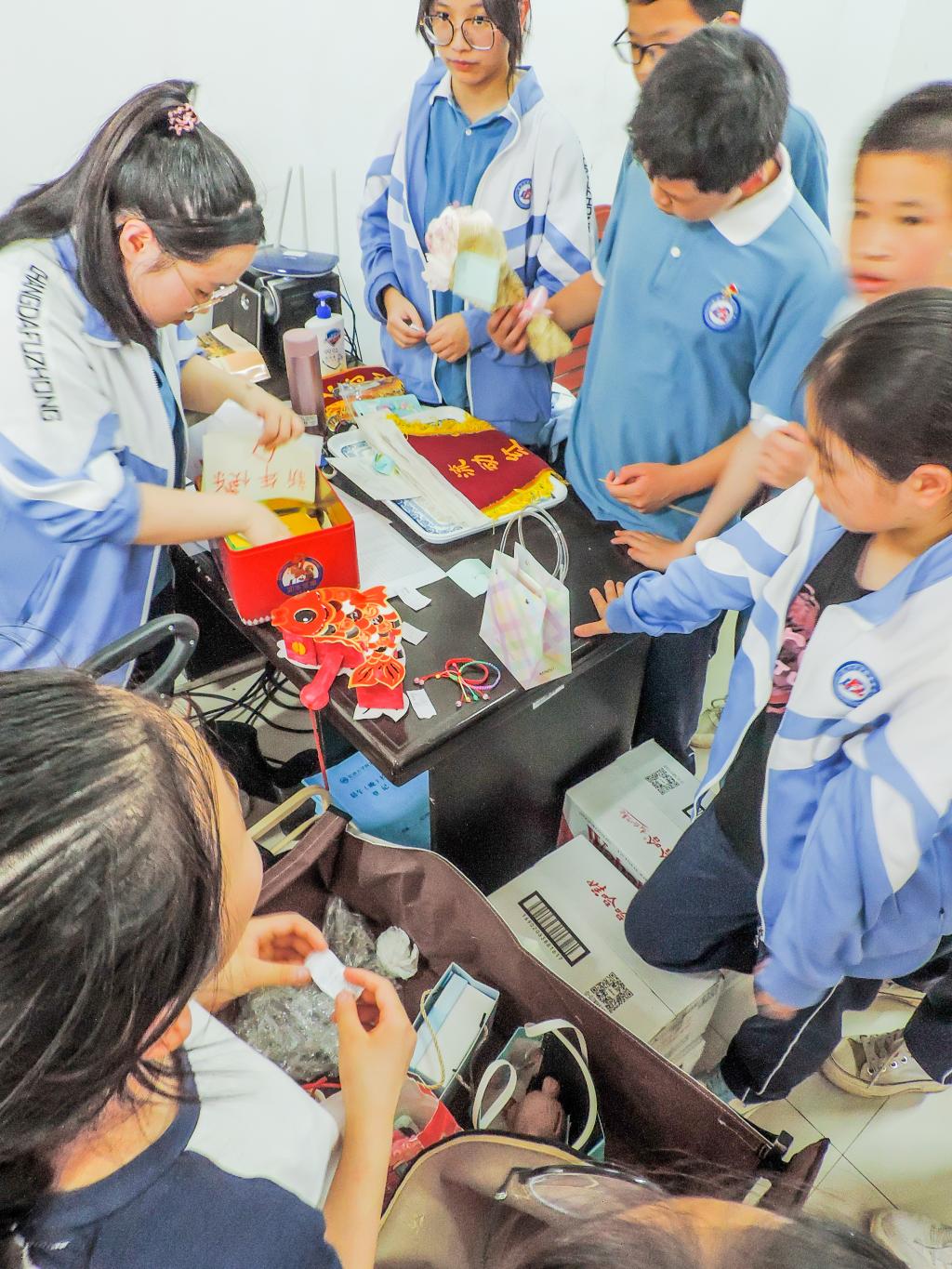 盲盒里有同学精心制作的贺卡、围巾、灯笼、礼品盒等手工制品,还有老师们的书画作品和手工制作的手环等作品。同学们拿着兑换券期待盲盒的开启。