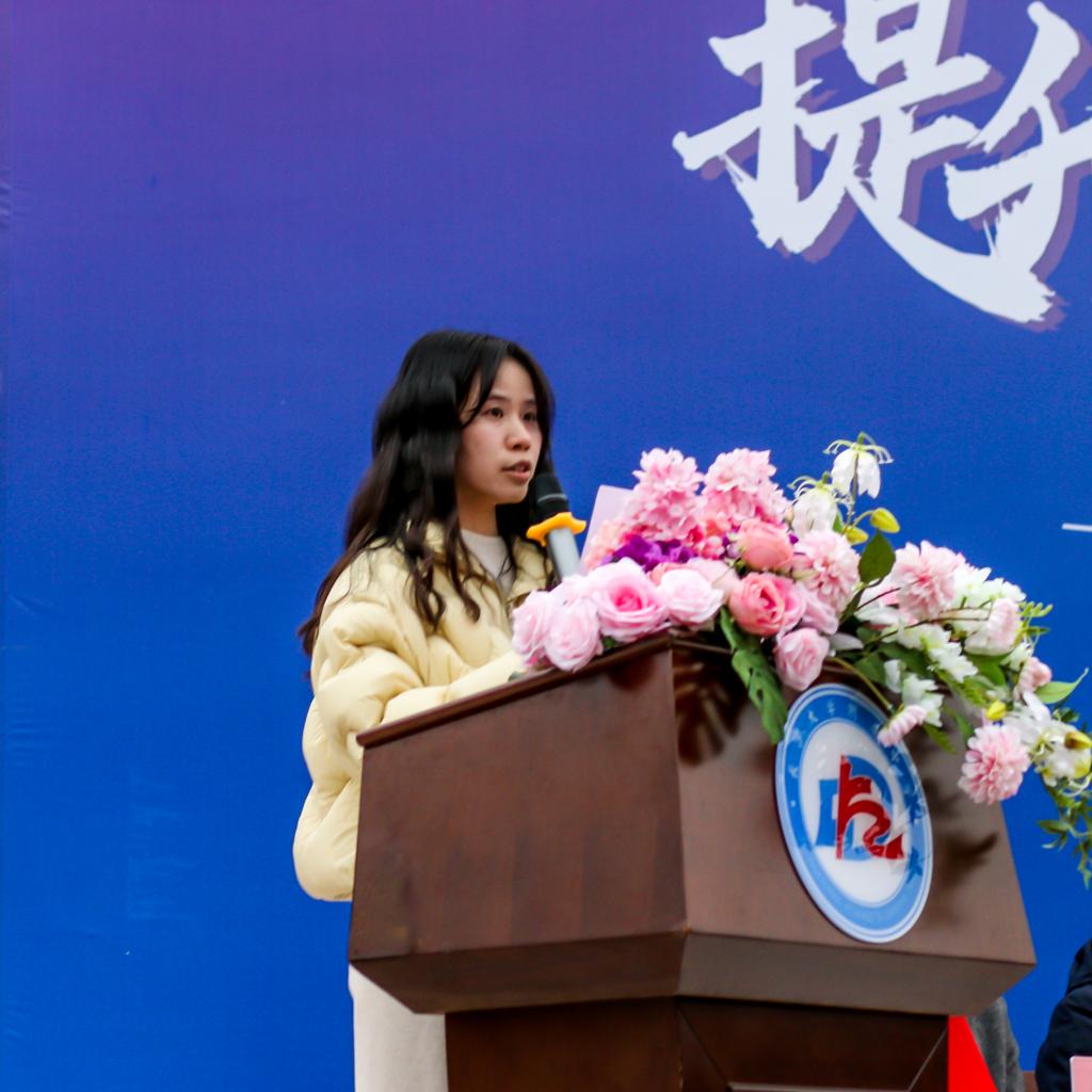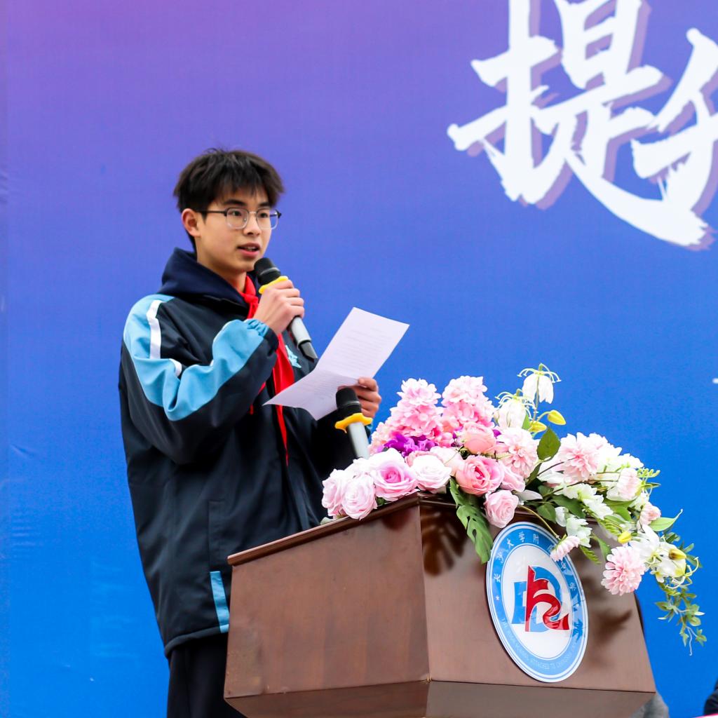 学生代表初三C2202严志轩同学回顾了往昔在学校的点点滴滴,这些经历和收获都化作了成长路上最温暖的注脚。他在发言中表达了对未来的期待和拼搏的决心,“‘道阻且长,行则将至,行而不辍,未来可期’让我们用行动证明:奋斗的青春最美丽,拼搏的汗水终将浇灌出理想之花。”