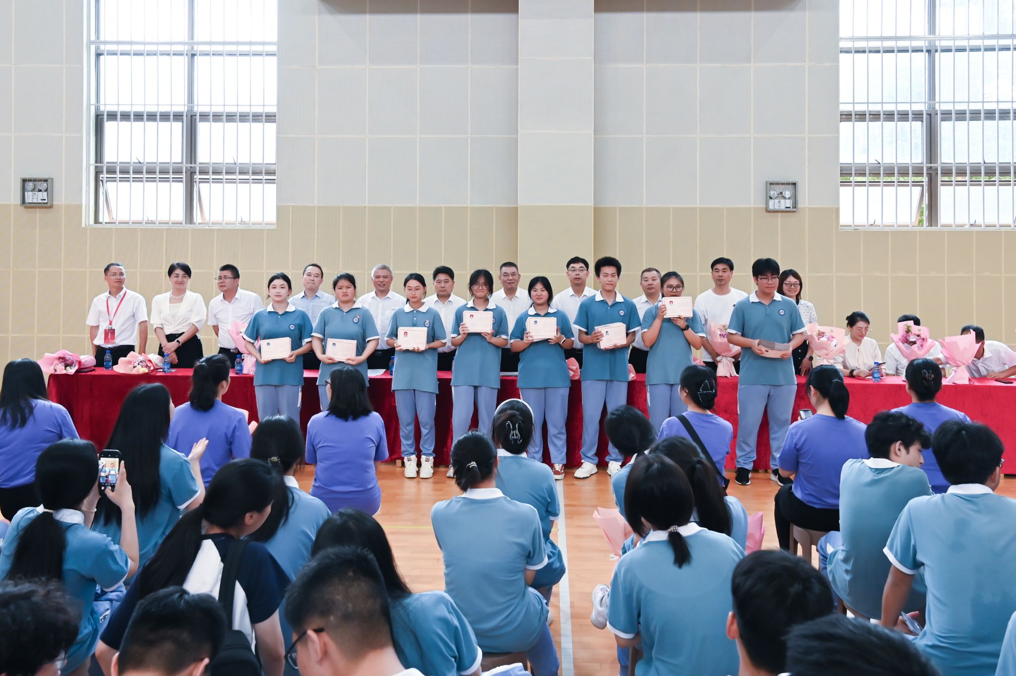 毕业生代表手捧芬芳的康乃馨,向班主任及任课教师深深鞠躬致谢。那些说不出口的感谢,那些来不及道的珍重,此刻都在花香中找到了最好的表达,会场里弥漫着无言的师生情谊。