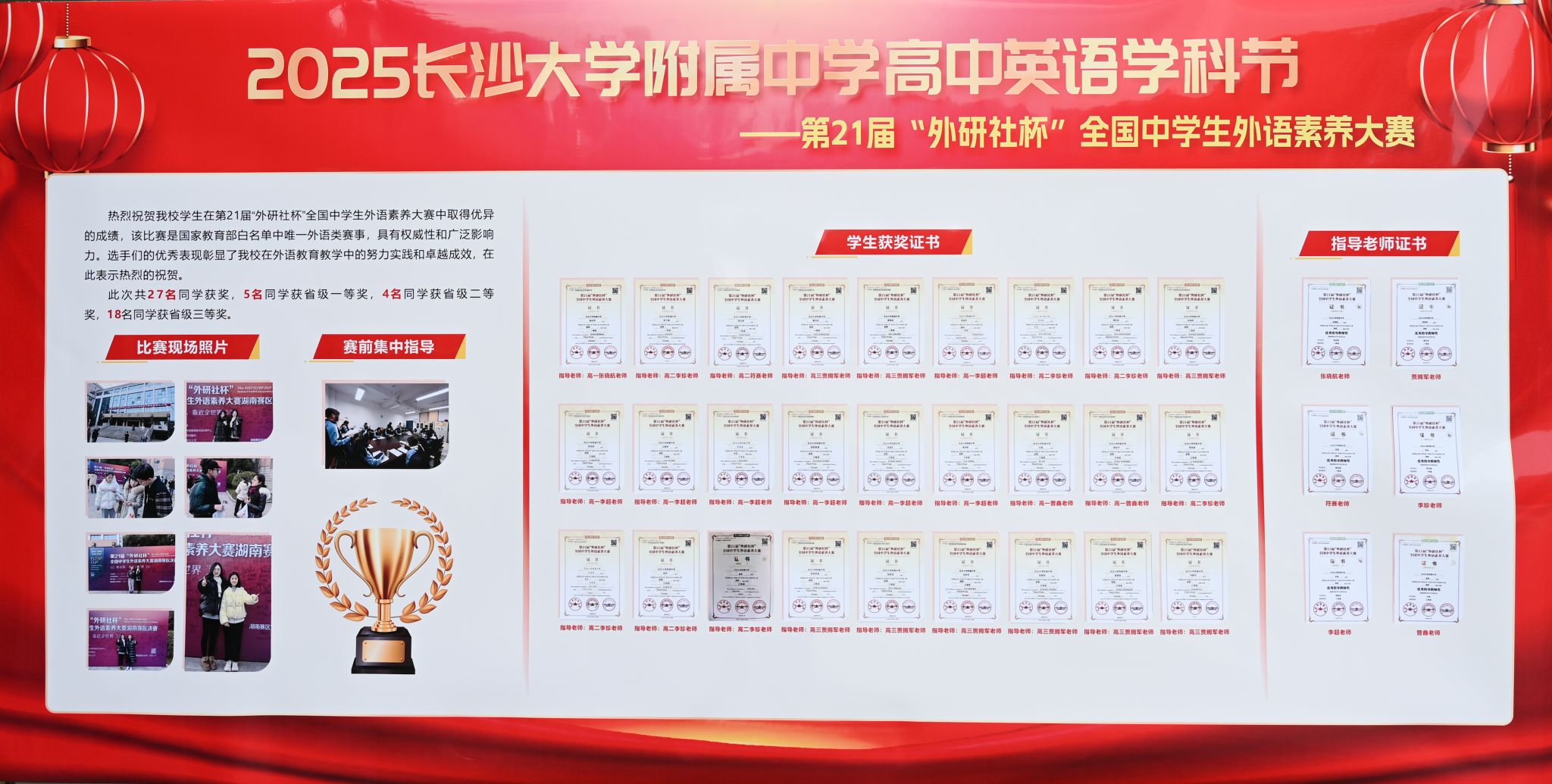 在第21届“外研社杯”全国中学生外语素养大赛湖南赛区比赛中,我校首次参赛斩获佳绩:27名学子从全省4万余名选手中脱颖而出,分别获省级一等奖5项、二等奖4项、三等奖18项。