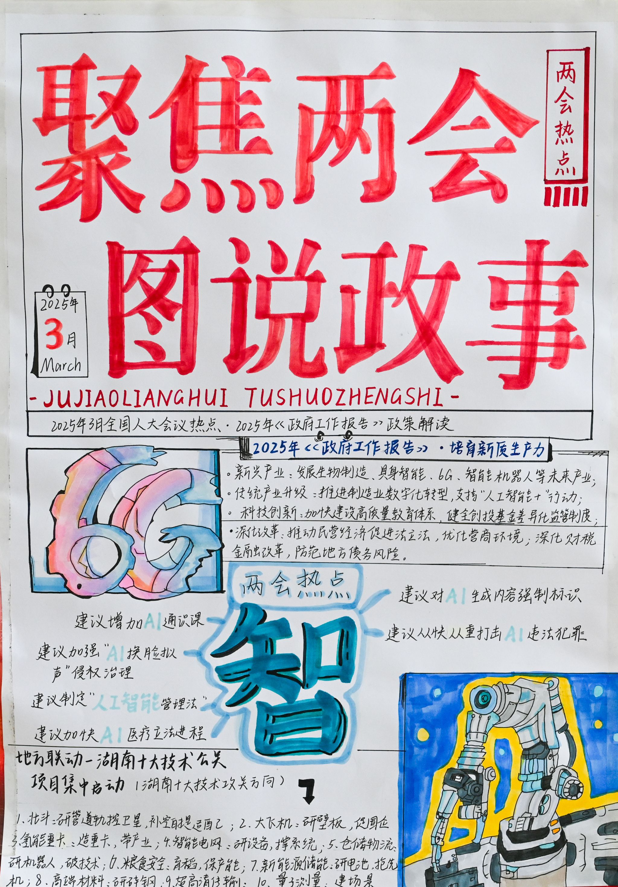 在2025年全国两会精神引领下,我校初、高中学生以手抄报为载体,用笔触勾勒时代脉搏,用创意诠释政治智慧。本次展览以“图说政事”为主题,学生作品紧扣《哪吒2》文化现象、航天科技突破和两会热点等时代命题,让思政教育走出课堂、融入生活,以实践行动响应两会“强化实践育人”的号召,在知行合一中培育家国情怀与理性精神。
