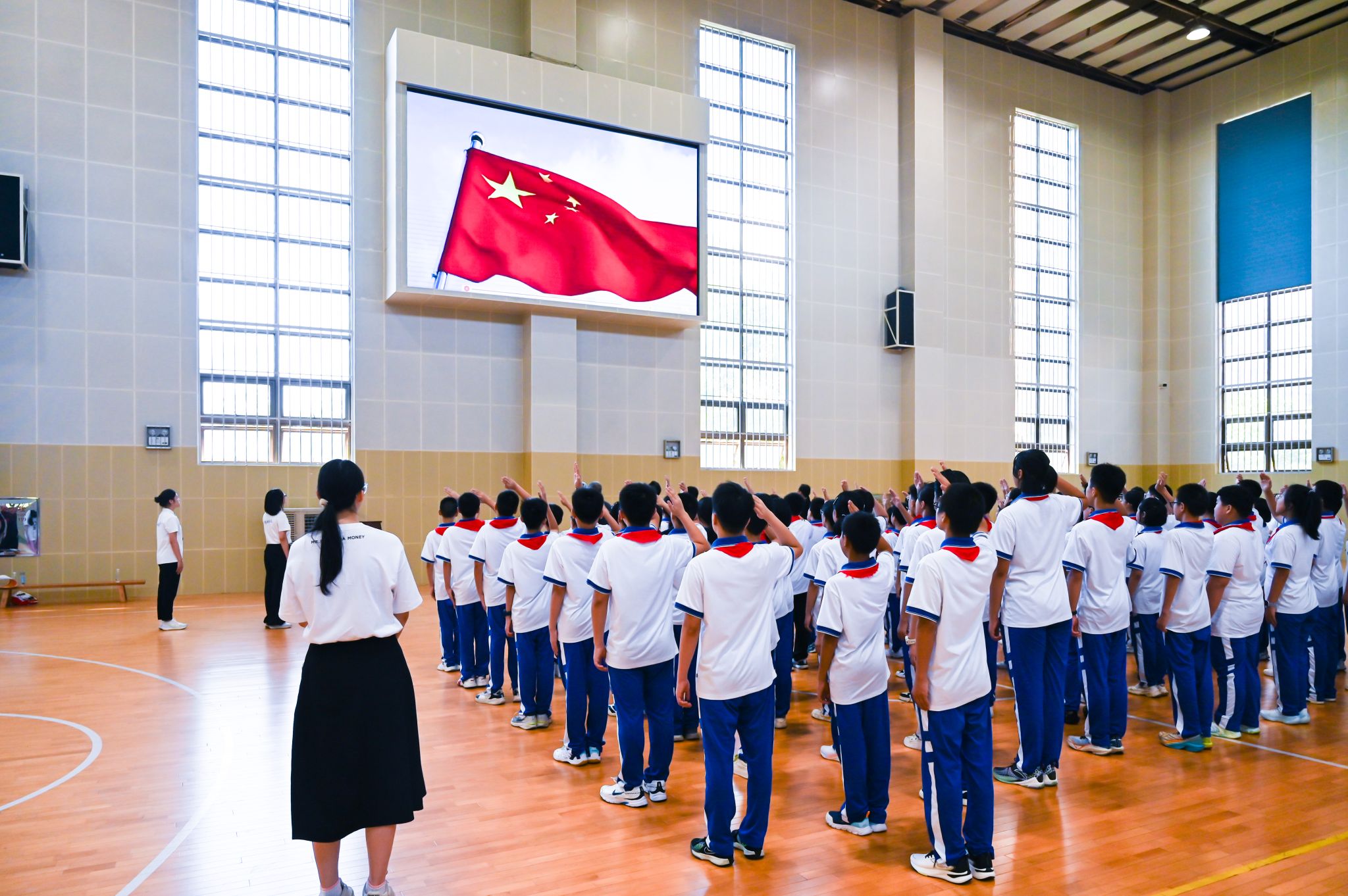 仪式在庄严的国歌声中正式拉开帷幕,全体师生肃立,少先队员行队礼致敬,目光齐聚鲜艳的五星红旗。这一刻,赤子心与中国红交相辉映,一股炽热的家国情怀在校园里澎湃涌动。