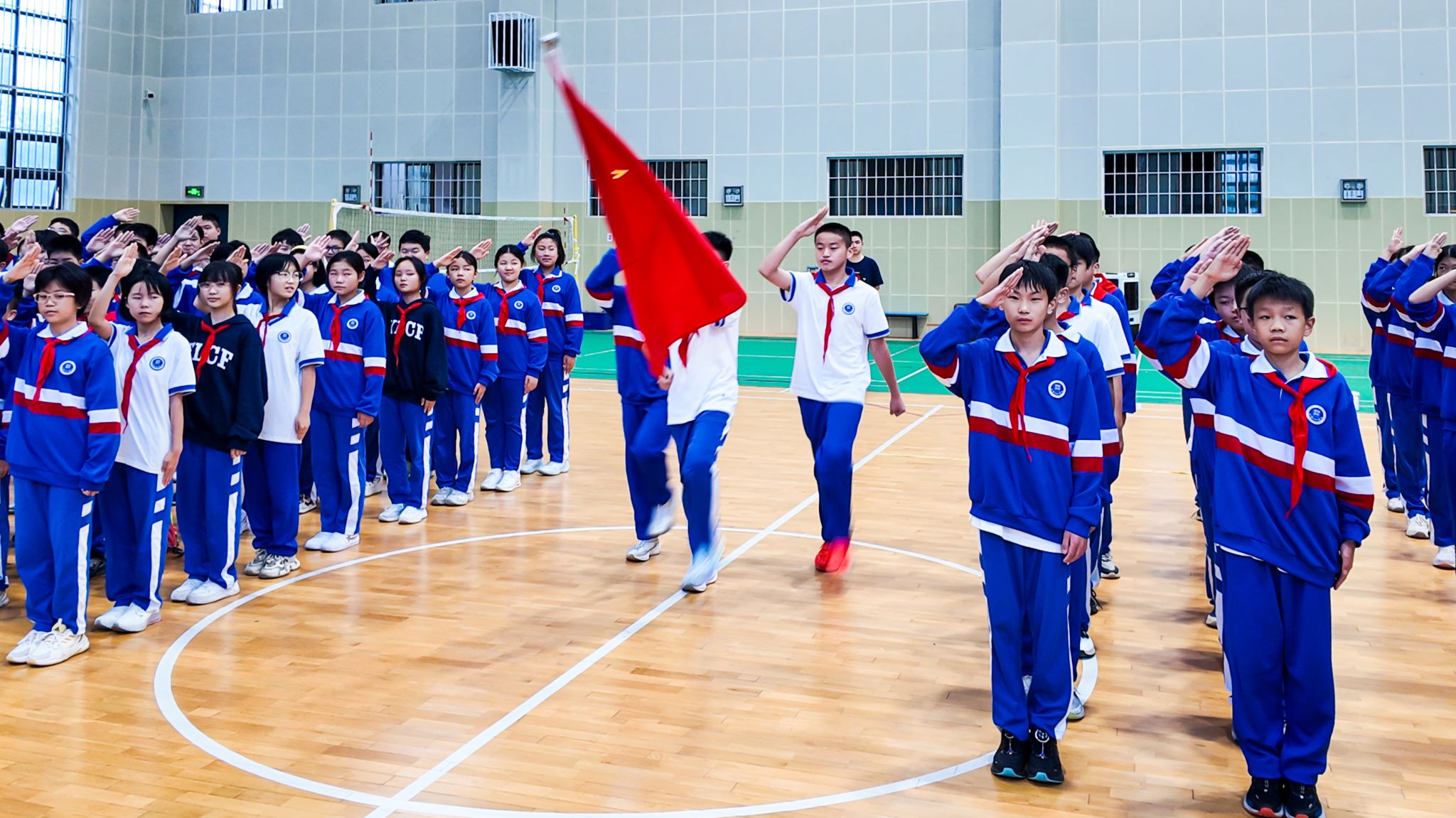 庄严的出旗曲奏响,仪式正式开启。大队旗手与护旗手高举队旗,步伐坚定有力。少先队员们行队礼,尽显新时代接班人的蓬勃朝气与青春担当。