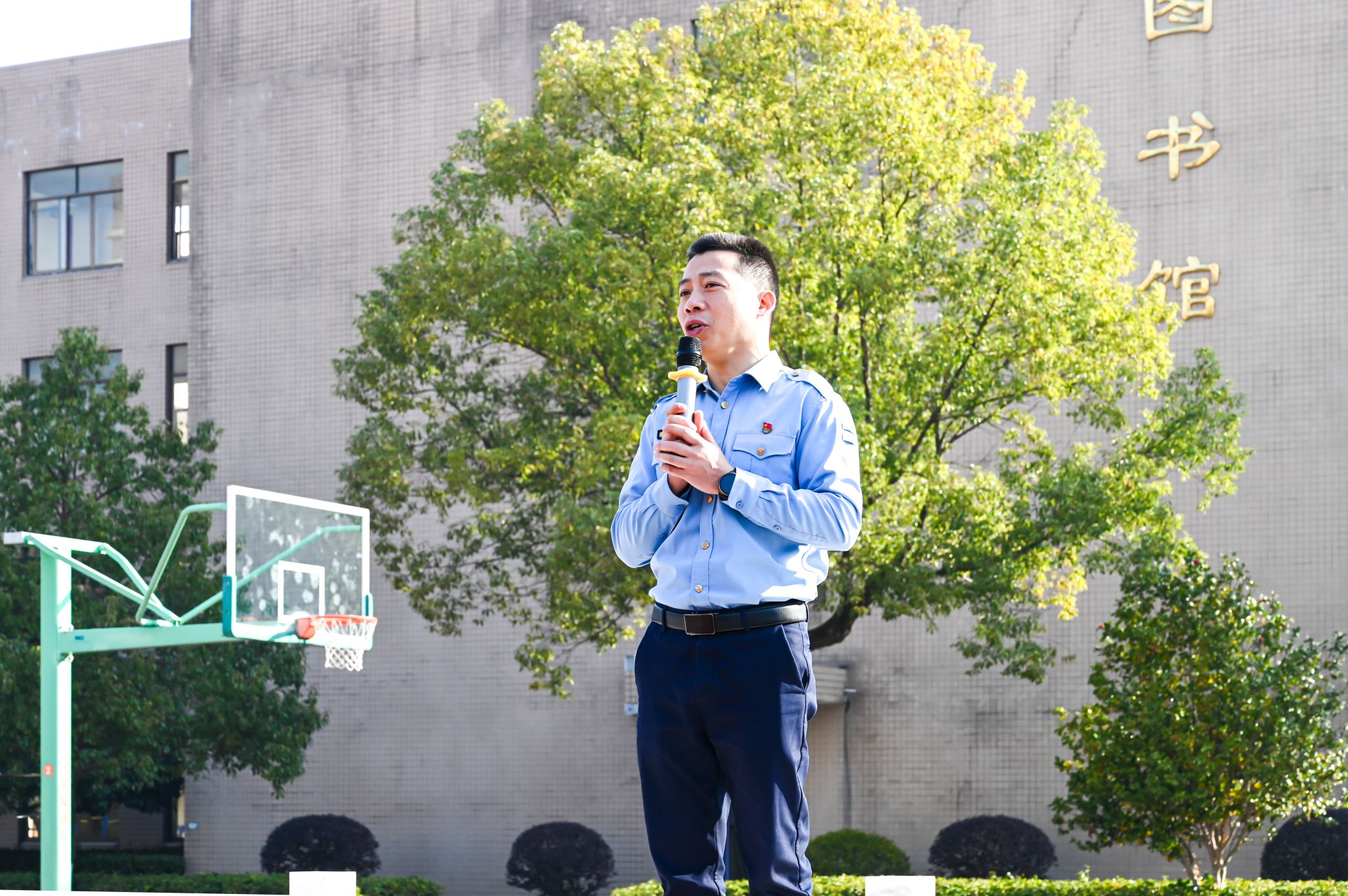集合清点完毕,保卫处主任卢军迅速跑至主席台,向演练总指挥王唯之校长报告了疏散结果。