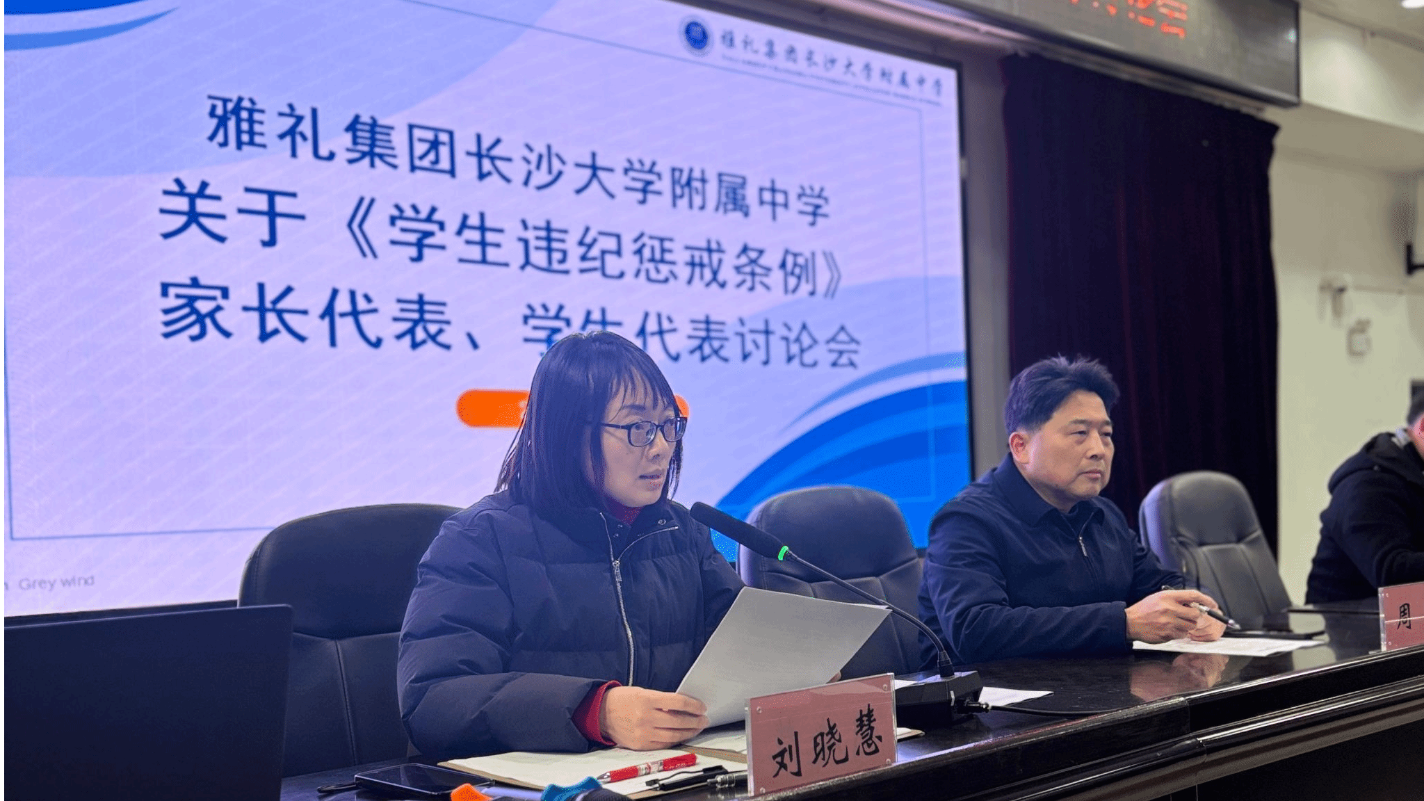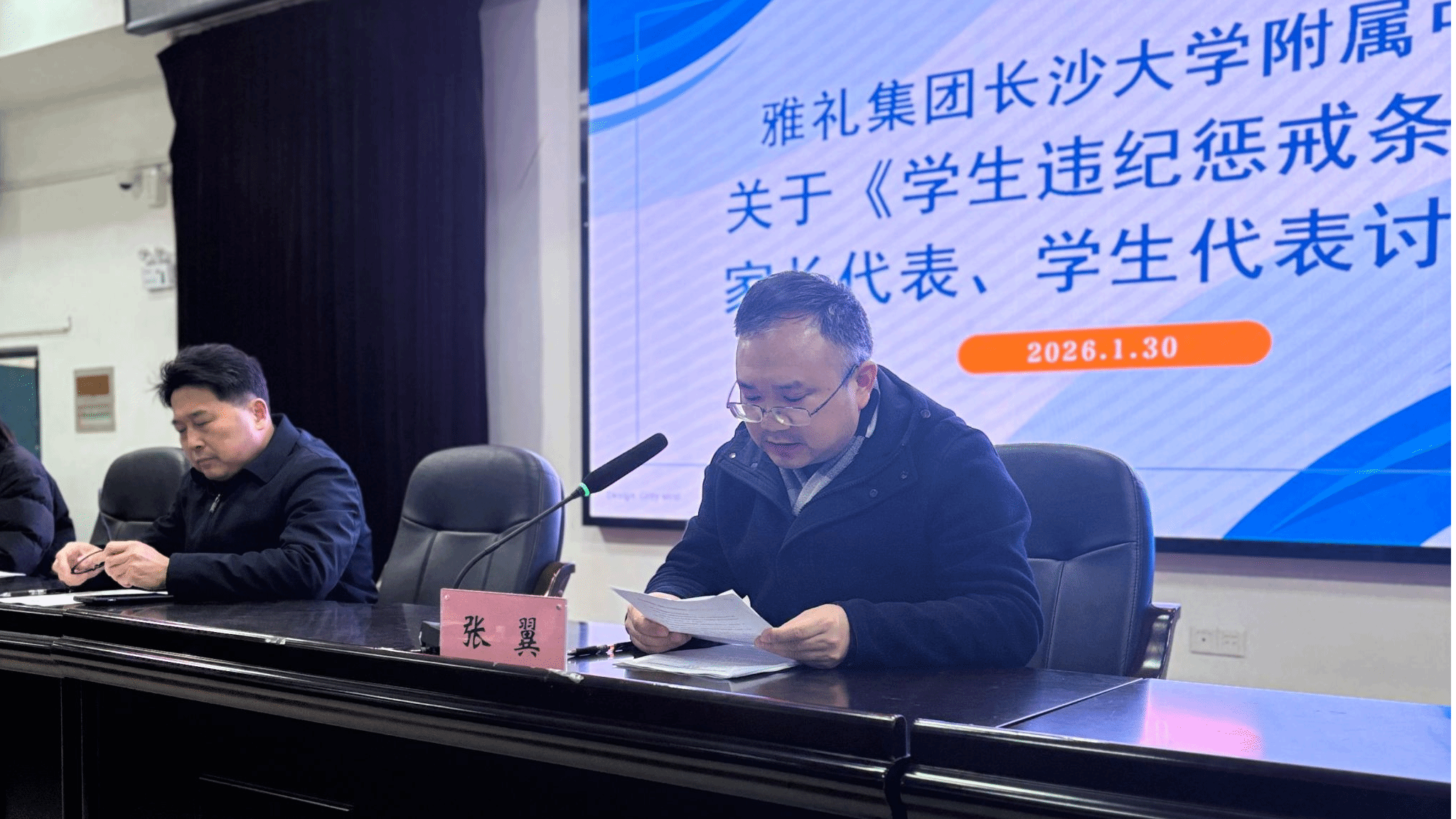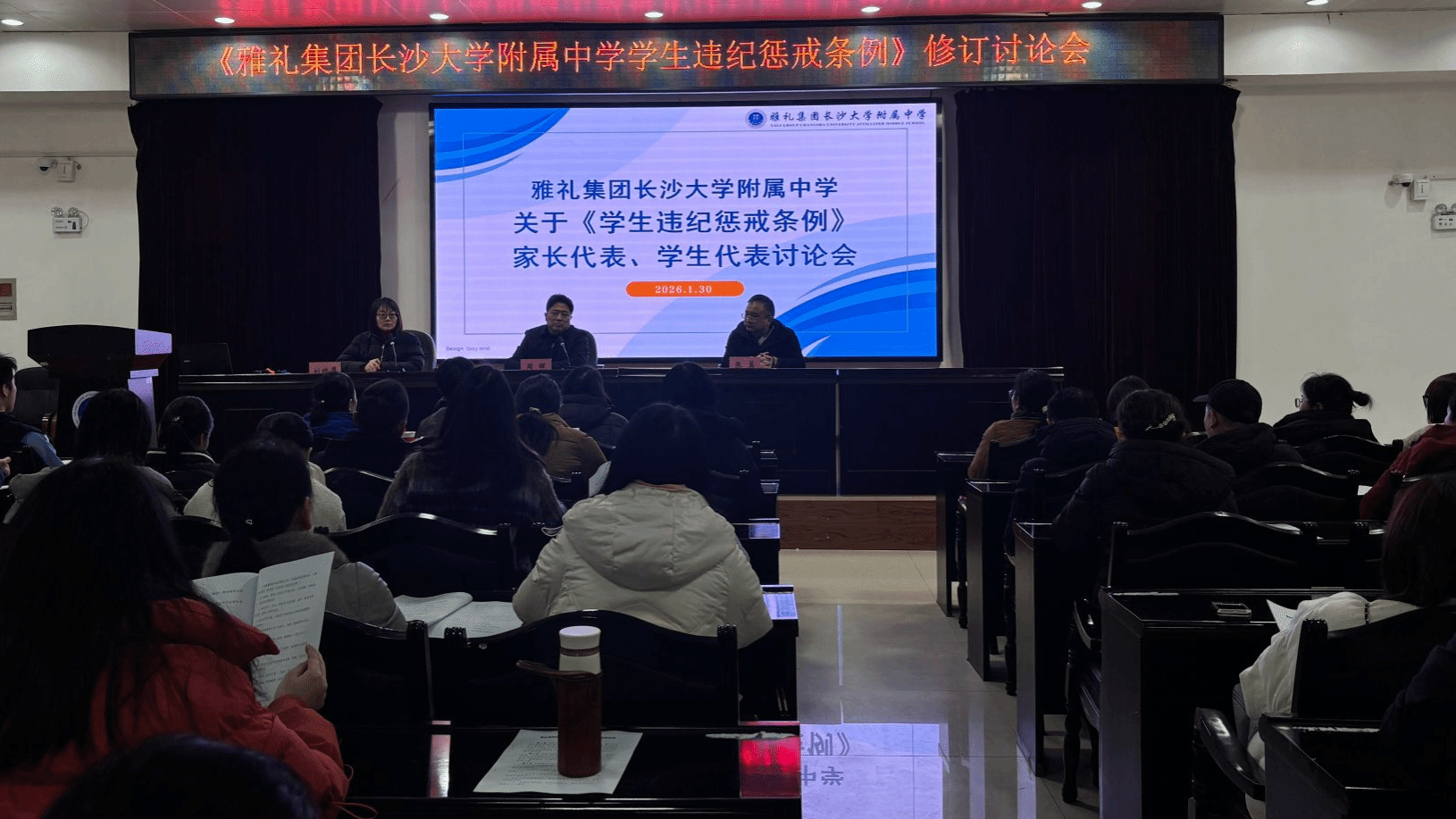 1月30日晚,雅礼集团长沙大学附属中学召开《学生违纪惩戒条例》(2026年版)修订讨论会。校方代表、家长代表与学生代表三方共同围绕条例内容展开充分交流,共同探讨校园管理新路径,构建学生成长支持体系。此次修订秉持民主、开放、协商的原则,广泛听取各方意见,致力于使条例更贴近学校教育实际、更契合学生成长规律、更凝聚家校协同合力。