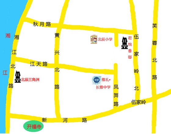 长沙市长雅中学(开福区江天路260号,北辰三角洲内,湘江北路往北过银盆岭大桥第一个红绿灯右拐;湘江北路往南出浏阳河隧道第二个红绿灯左拐。公交可以坐到新河站、两馆一厅站或华夏站下。)