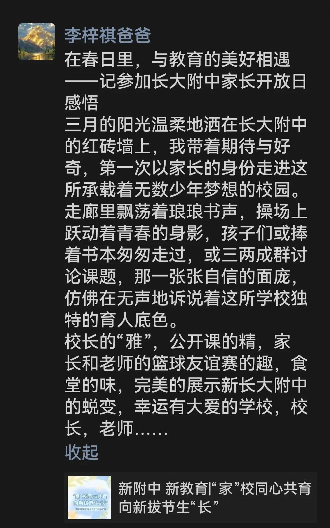教育最美的样子,莫过于学校倾力奔赴、家长全力托举、孩子向阳生长。昨天,我在开放日看到了这种可能;未来,我愿以行动守护这份可能。