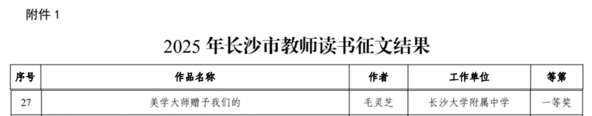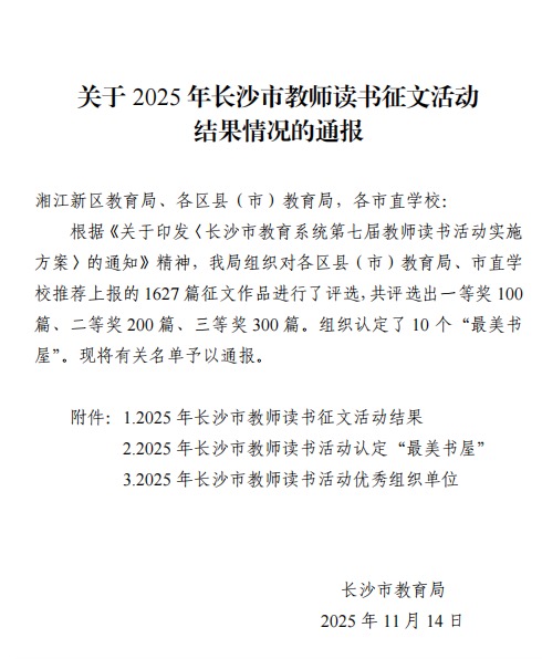 近日,2025年长沙市教师读书征文活动获奖结果正式公布。本次活动吸引了全市教育系统踊跃参与,征文作品总量达1627篇,佳作云集。在此次高水平、高规格的评选活动中,我校7名教师的征文脱颖而出,荣获佳绩。