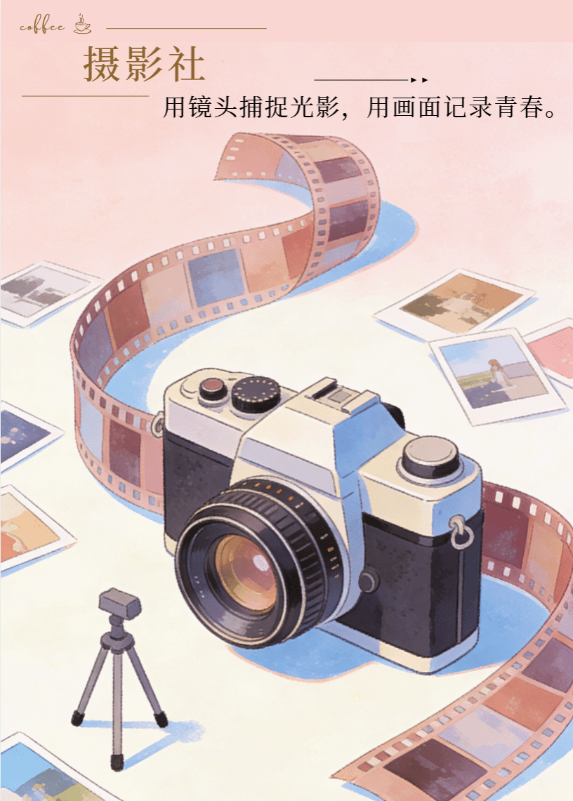 社团简介:每一张照片,都是时光的标本。在摄影社,我们不只教你如何构图、如何调光,更陪你一起寻找属于你的视角。社团定期组织校园内外采风、主题摄影挑战赛、大师作品赏析会,让你在交流中不断提升。按下快门,定格热爱——摄影社期待与你一同框住美好。