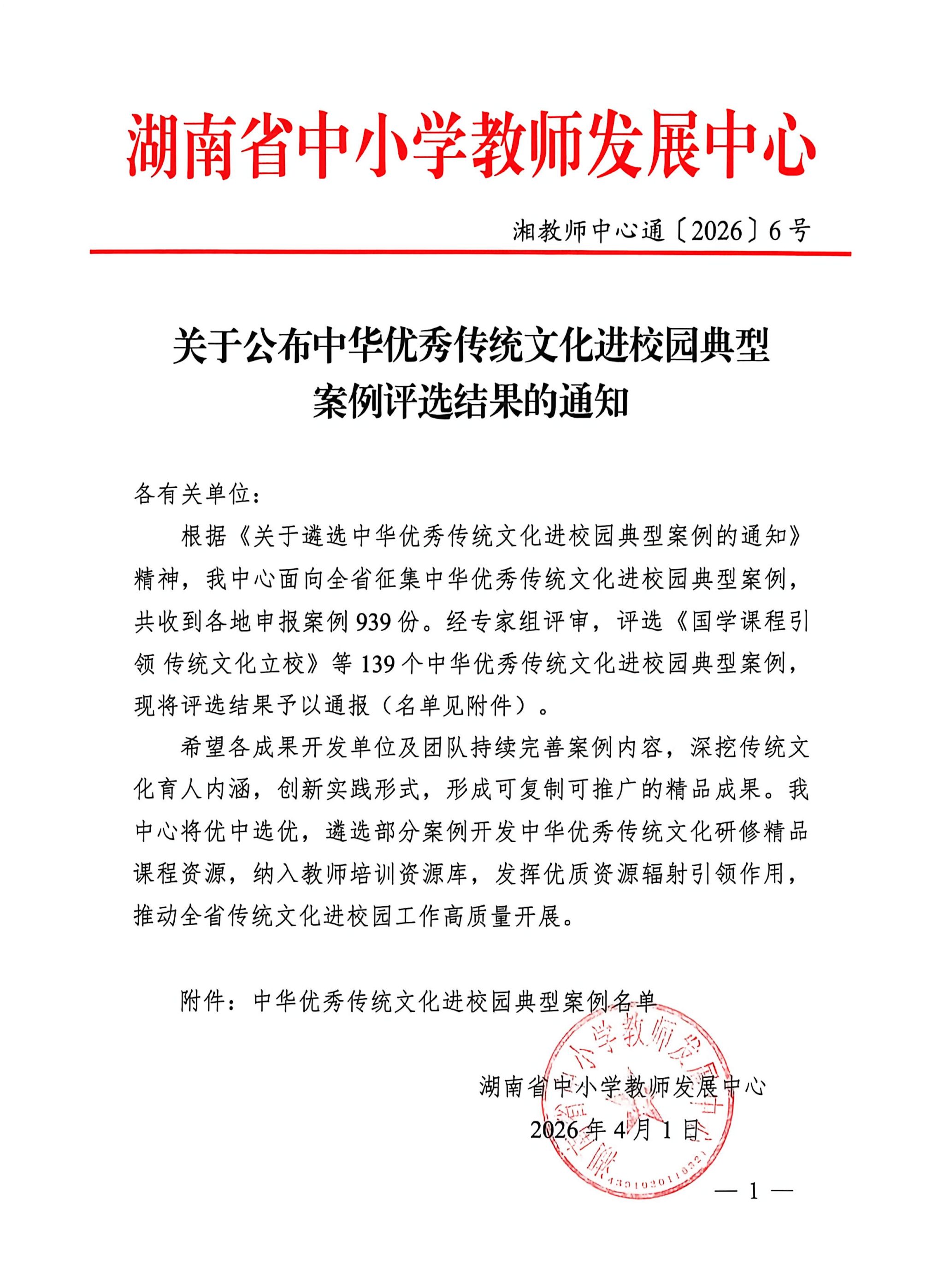 本次评选旨在挖掘和推广一批可复制、可推广的中华优秀传统文化进校园典型经验,经专家组严格评审,最终共评选出139个典型案例。我校案例的成功入选,充分彰显了学校在传统文化育人方面的深厚积淀与创新实践。