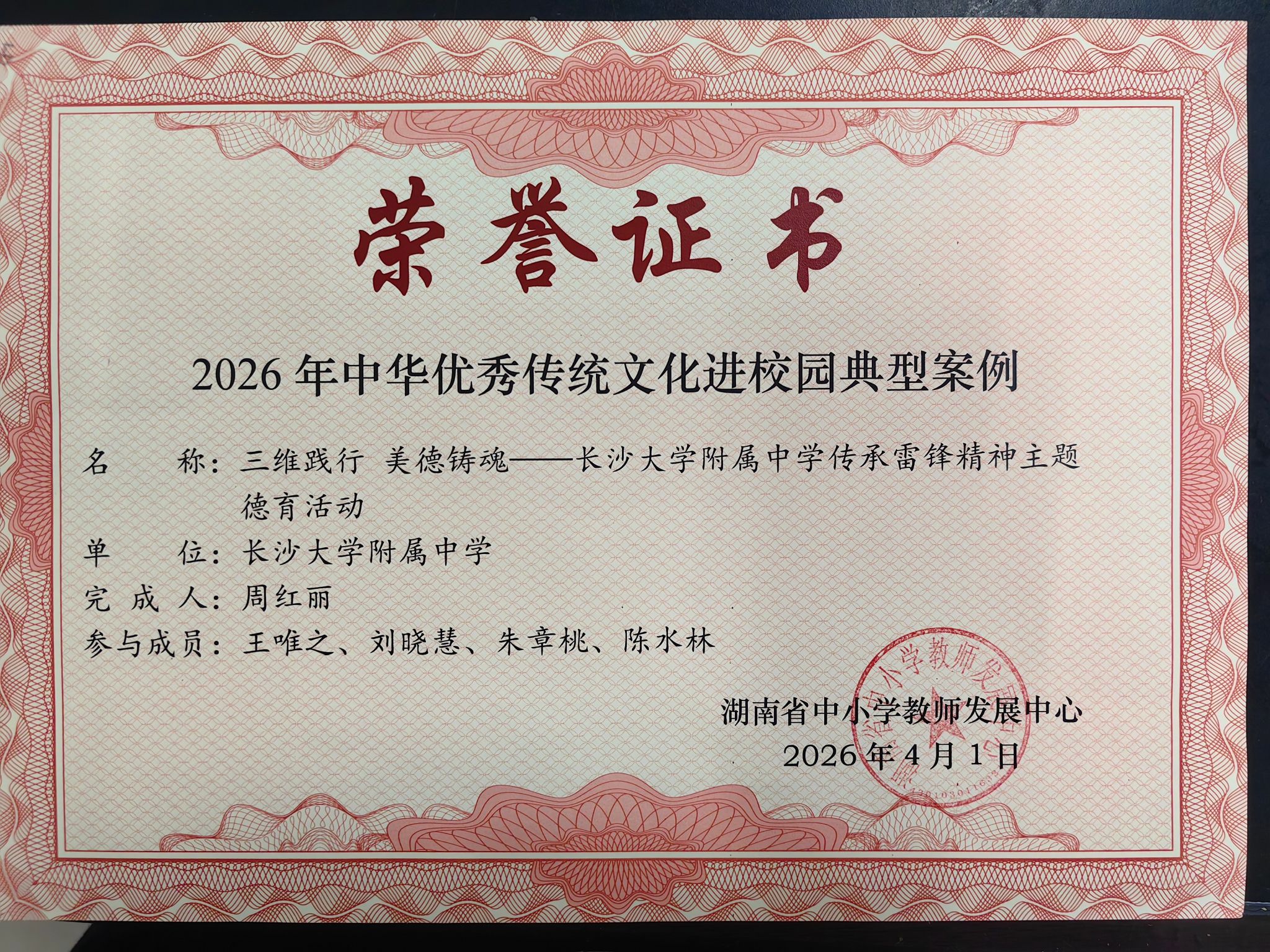 近日,湖南省中小学教师发展中心印发了《关于公布中华优秀传统文化进校园典型案例评选结果的通知》,我校申报的《三维践行 美德铸魂——长沙大学附属中学传承雷锋精神主题德育活动》从全省939份参评作品中脱颖而出,成功入选省级典型案例。